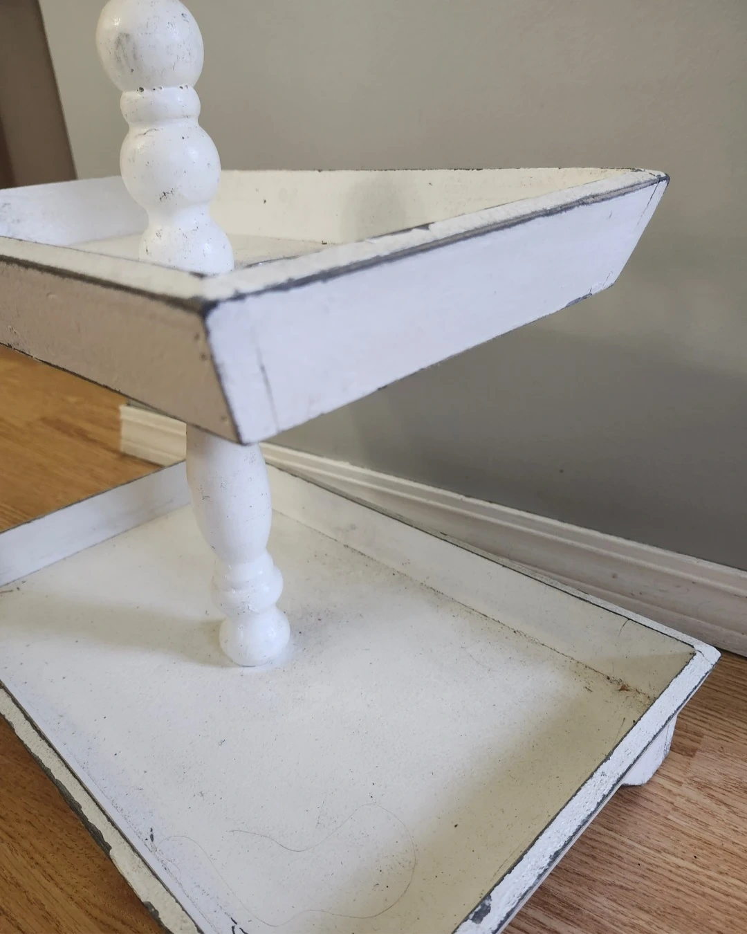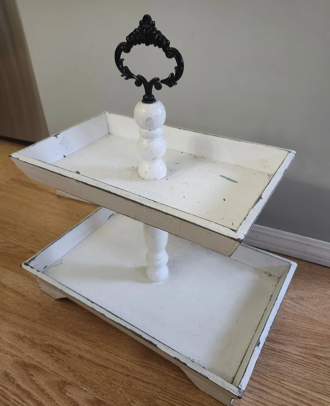 White two-tiered tray made of wood and features a distressed finish. Great for displaying treats or small decor items!