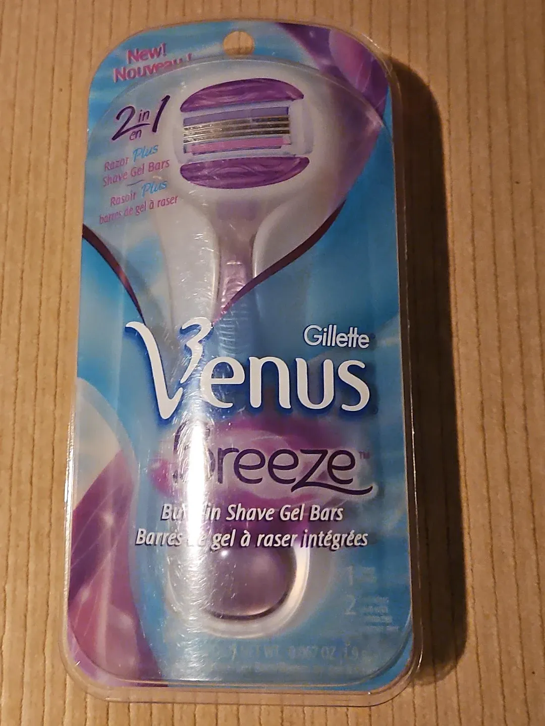 This is a Gillette Venus Breeze razor featuring 2-in-1 functionality. It comes with built-in shave gel bars, making it convenient for use. It's designed for a smooth shave.