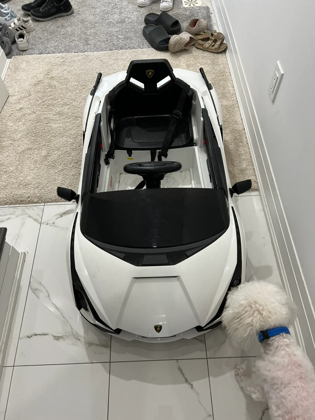 Selling a super fun Lamborghini ride-on car for kids! It's in great shape and ready for a new little driver. The car is white and features the iconic Lamborghini design. Your child will love cruising around in this stylish ride-on toy!