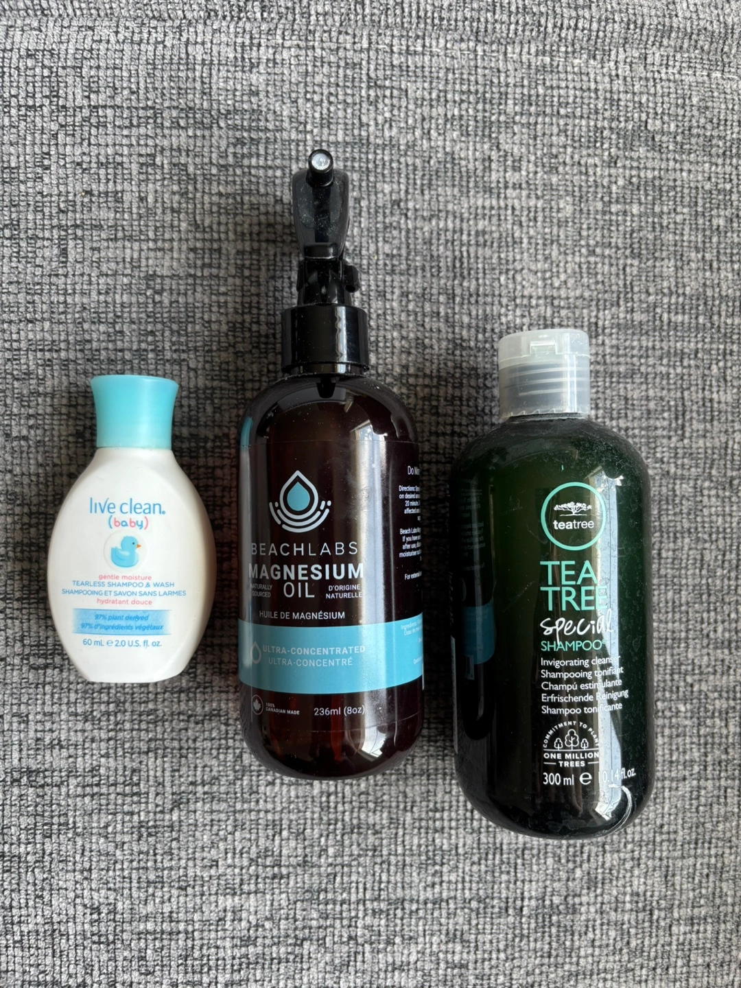 A collection of bath and body products ready for use, including shampoo, and oil.