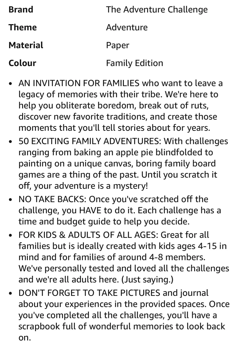 Buy & SellThe Adventure Challenge Family Edition - Scratch Off BookThe Adventure Challenge Family Edition - Scratch Off Book$40Family Edition scratch-off adventure book with 50 challenges for kids and adults. Includes a budget guide for each activity. New, in box.ConditionNewWHERE TO MEETTwo Park Central apartmentView MapSELLERverifiedMelanieBeltline832 reviews0 chats·0 favorites·1 viewsSEND CHAT TO SELLERHi Melanie! I’m interested in your listing.Hi Melanie! I’m interested in your listing.Get the Karrot app to chatSign In to chat
