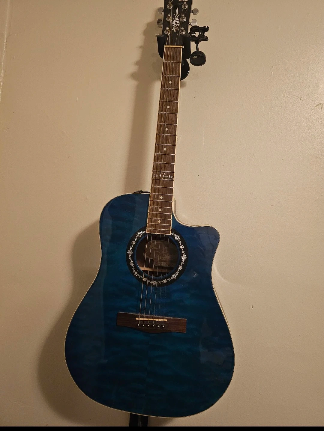 Fender acoustic electric guitar in a vibrant blue finish. It features a cutaway body for easier access to higher frets. This guitar has a beautiful flame maple top and a comfortable neck.