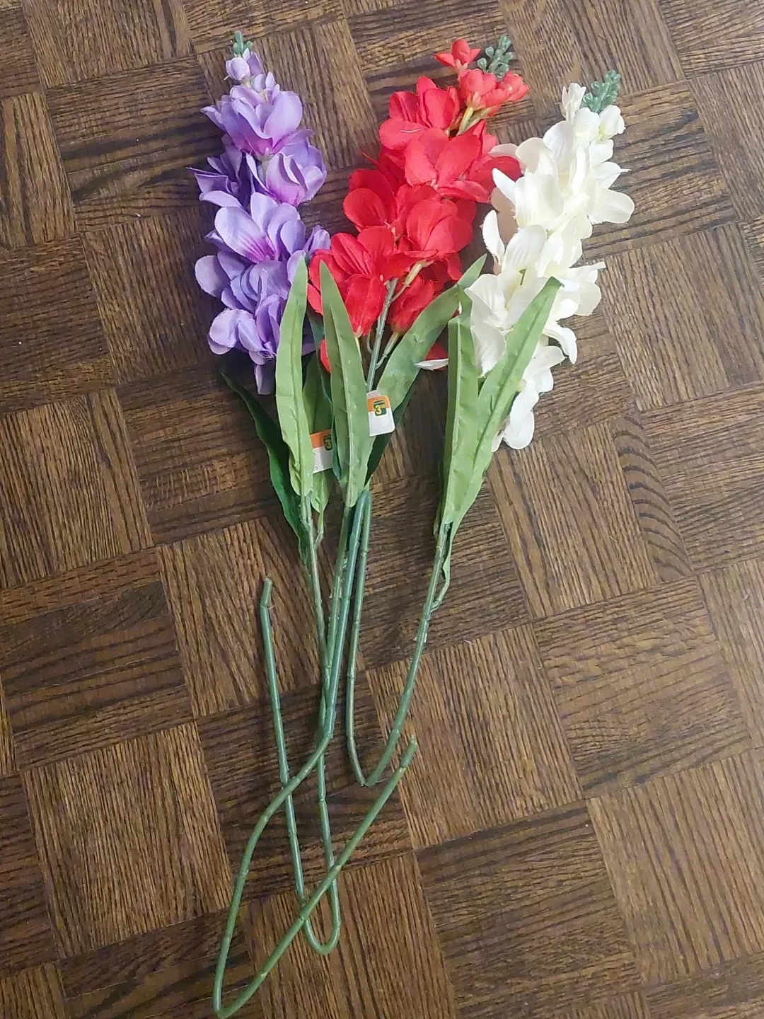 Selling a set of artificial flower stems in red, white, and purple. These are great for adding a pop of colour to any room or for crafting projects. They're in good condition and ready to be used!