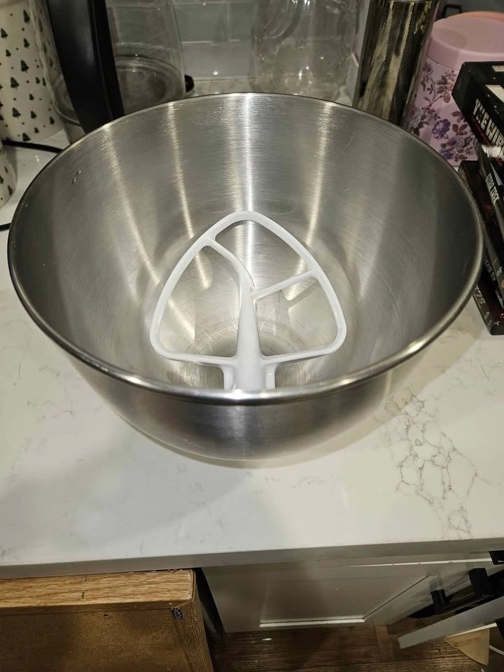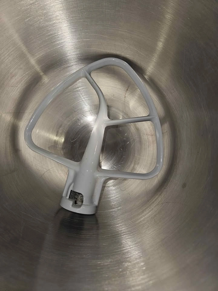 Clean and solid with normal cosmetic wear from regular use (light surface scratches — see photos). No dents or cracks. Includes the white flat beater/paddle attachment shown.