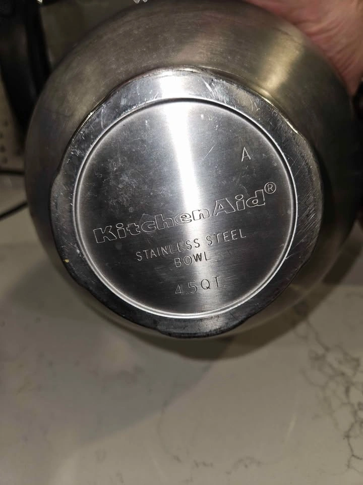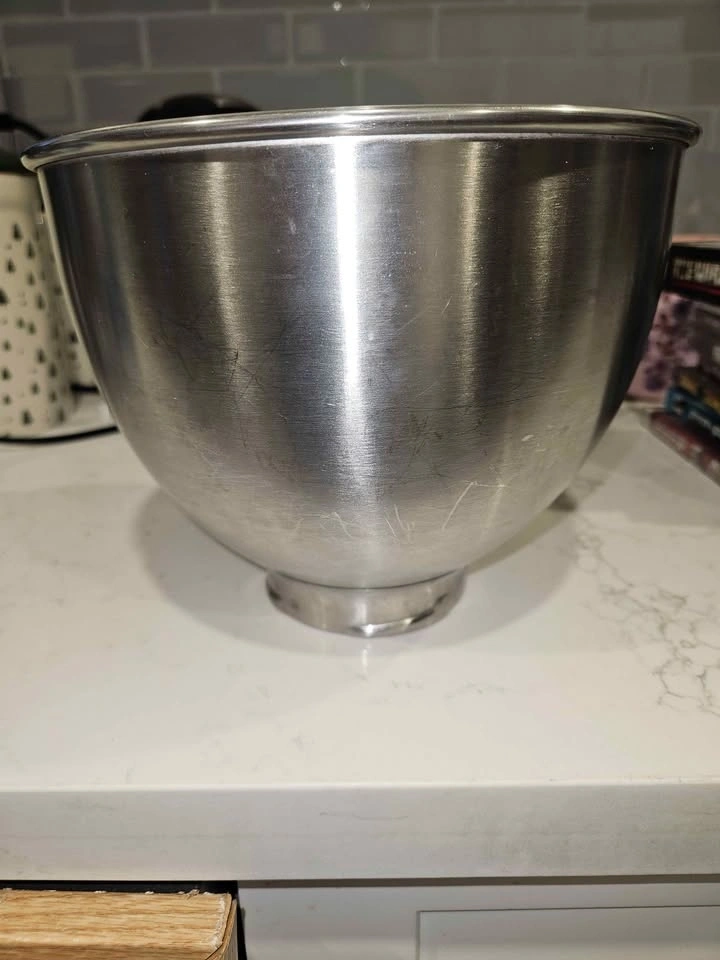 Genuine KitchenAid stainless steel mixing bowl, 4.5 quart capacity. Durable, heavy-duty bowl ideal for baking, cooking, and food prep.