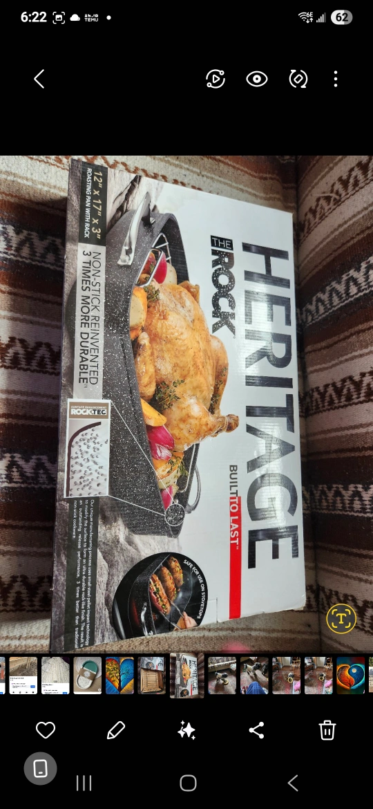 This is The Rock Heritage roasting pan with a rack. It's built to last and features a non-stick surface. The pan measures 12" x 17" x 3". if interested please text 306 361 0562 ask for Lorie