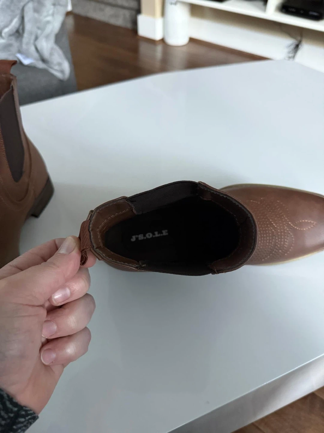 Stylish brown Chelsea boots with elastic side panels. These boots feature a pull tab at the back for easy on and off. Brown faux leather material.