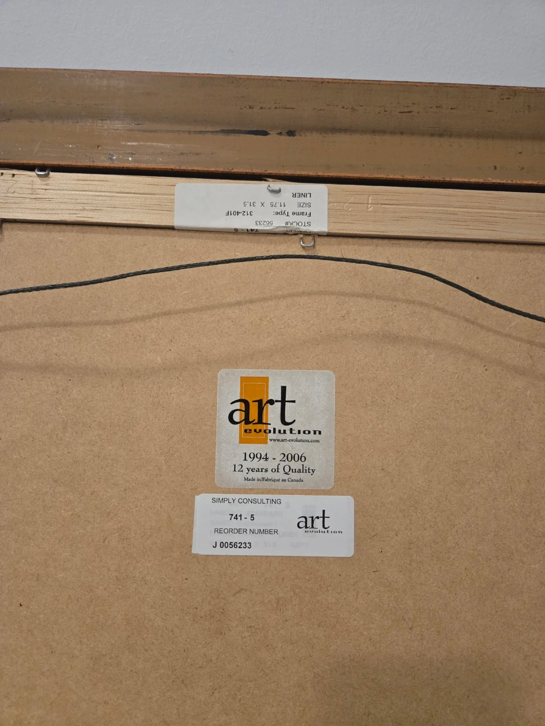 Framed art print depicting a European-style street scene with buildings. The print has a textured finish. It's encased in a black and gold frame. This piece would fit well in a hallway or narrow wall space.