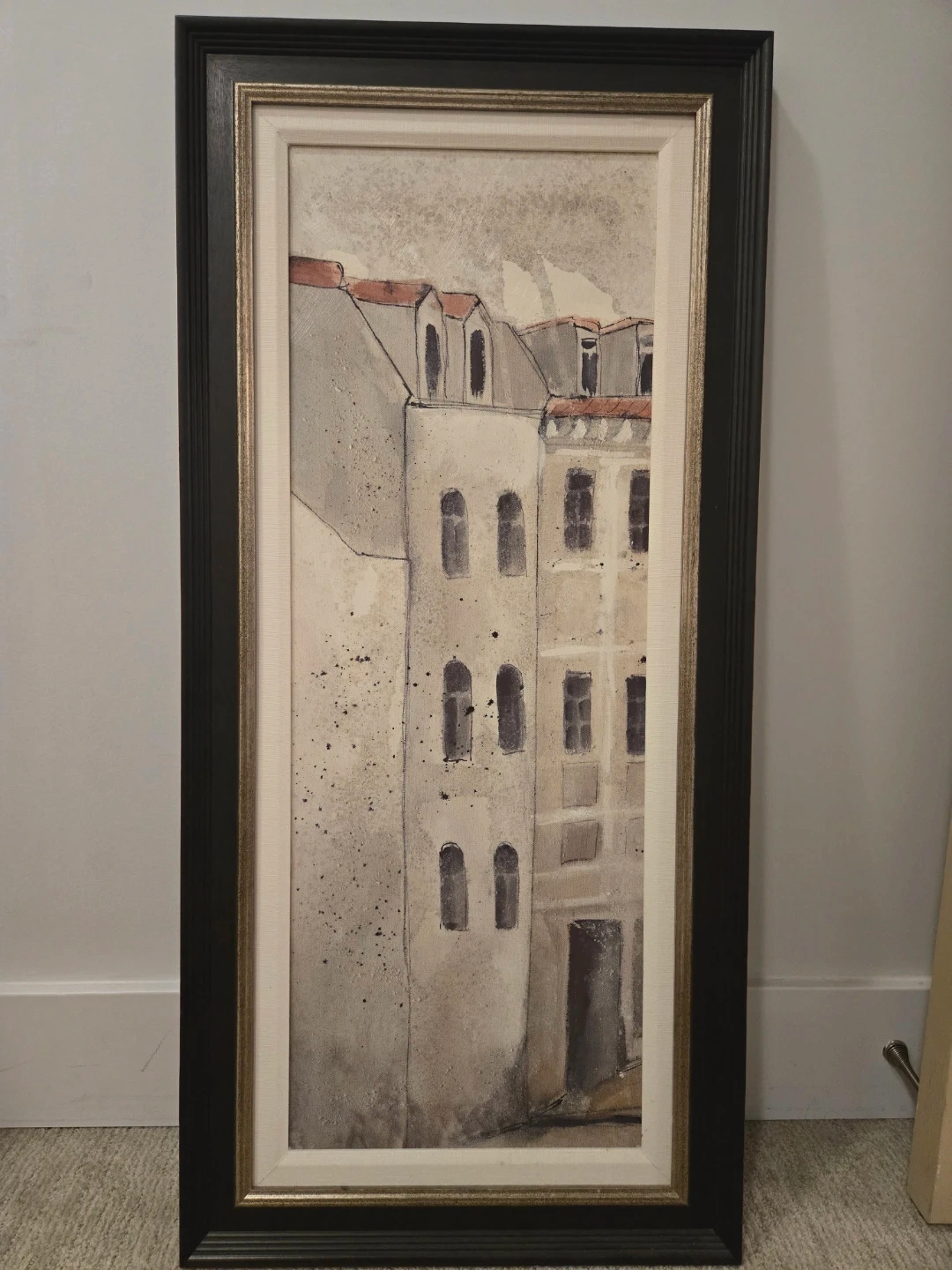 Framed art print depicting a European-style street scene with buildings. The print has a textured finish. It's encased in a black and gold frame. This piece would fit well in a hallway or narrow wall space.