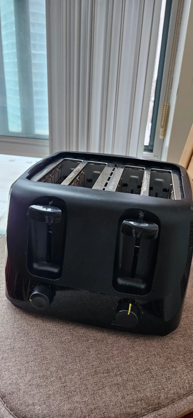 Selling a black 4-slice toaster! It has some visible wear and tear on the side, but it's still fully functional and ready to make some toast. Perfect for a family or anyone who loves a good breakfast