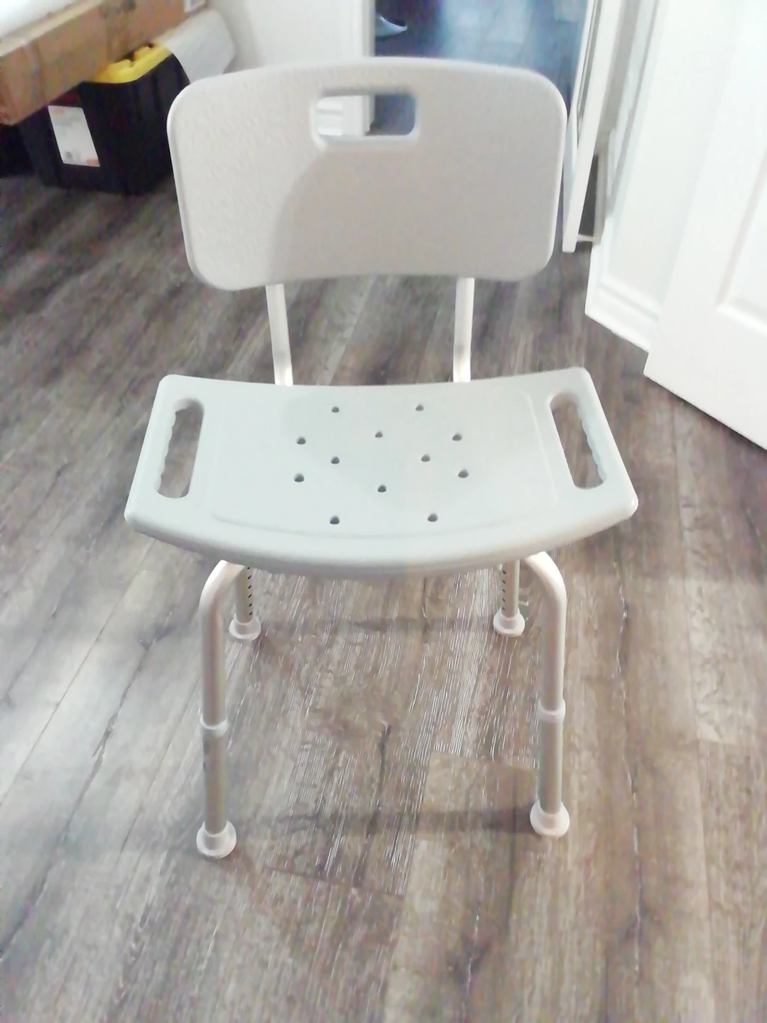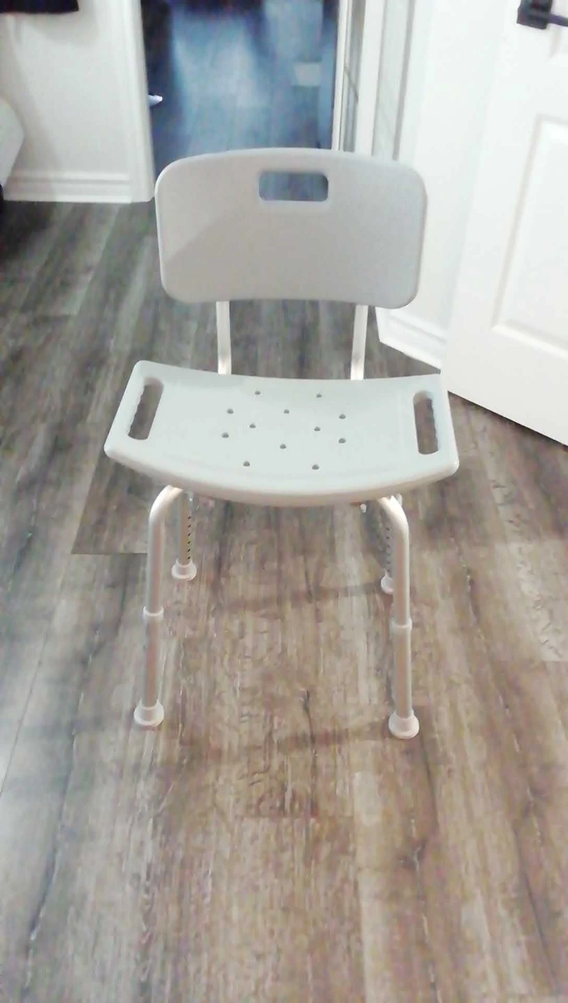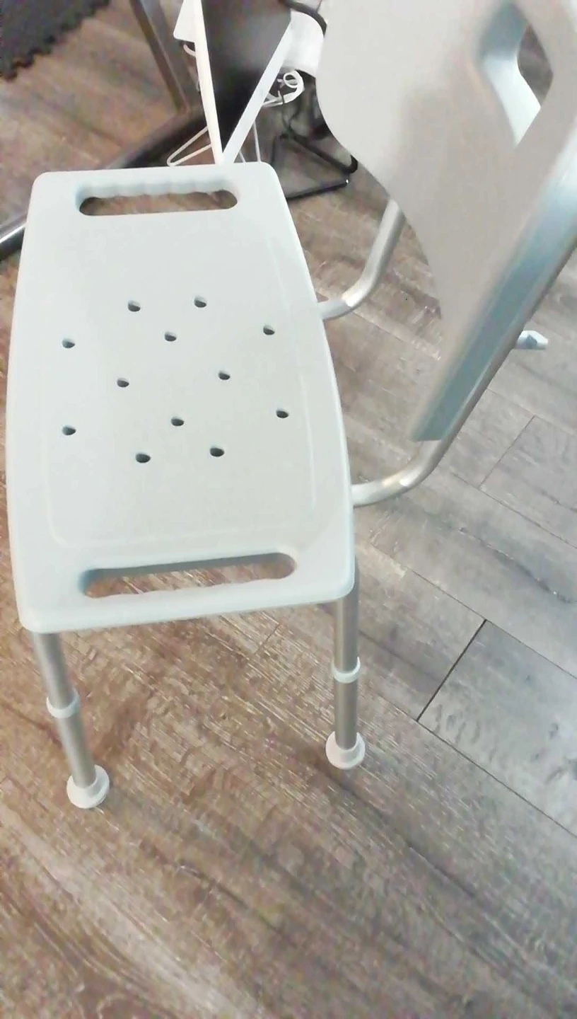 Adjustable height shower chair with backrest and armrests. It's made of durable plastic and aluminum. This chair offers stability and support in the bath or shower.Dad is in a retirement center no need for it