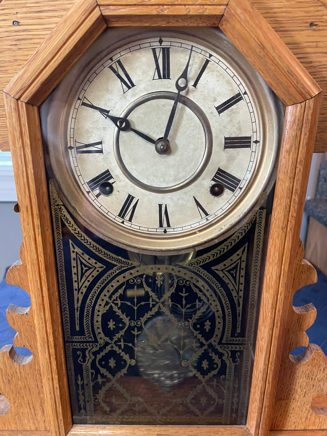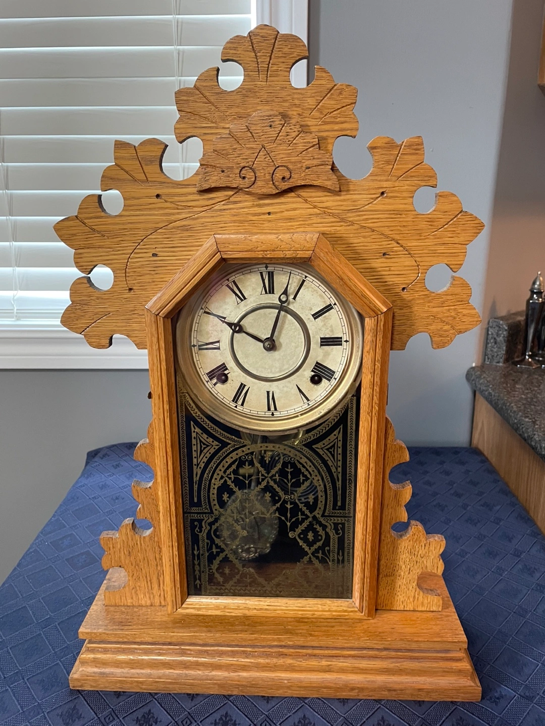 Selling a lovely antique gingerbread clock. It has a beautiful design and would make a great addition to any home. Comes with the original winding key & is working