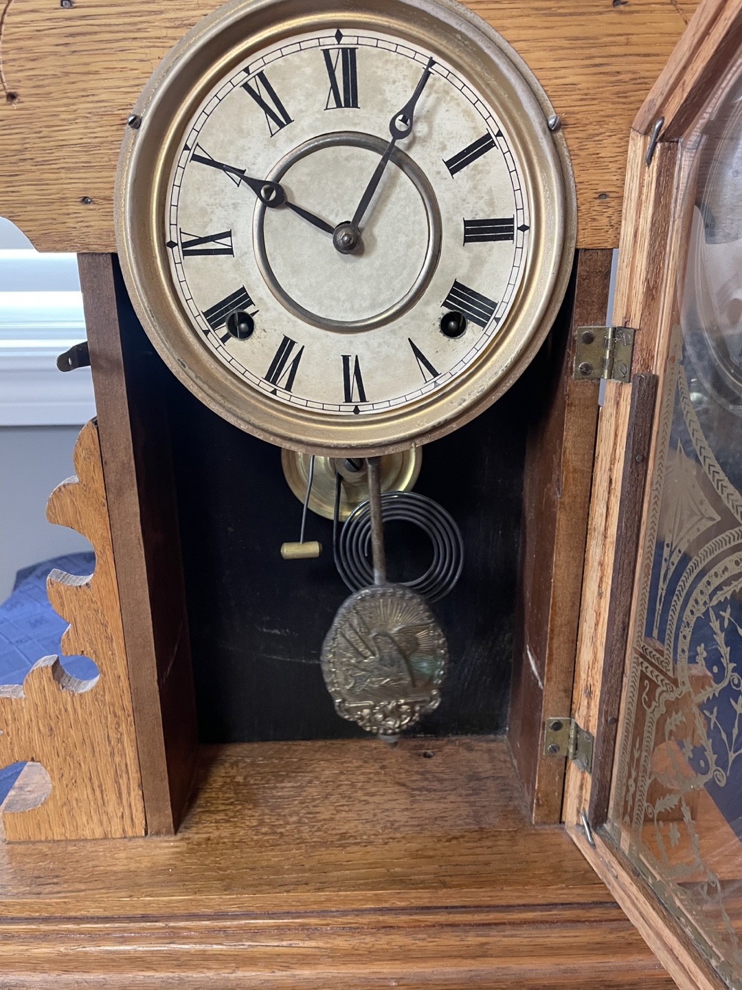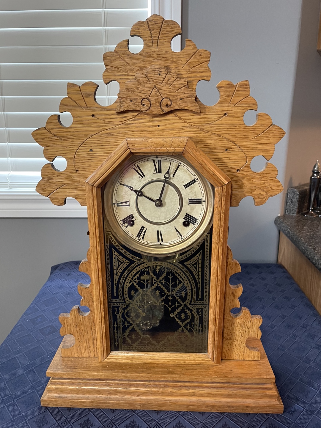 Selling a lovely antique gingerbread clock. It has a beautiful design and would make a great addition to any home. Comes with the original winding key & is working