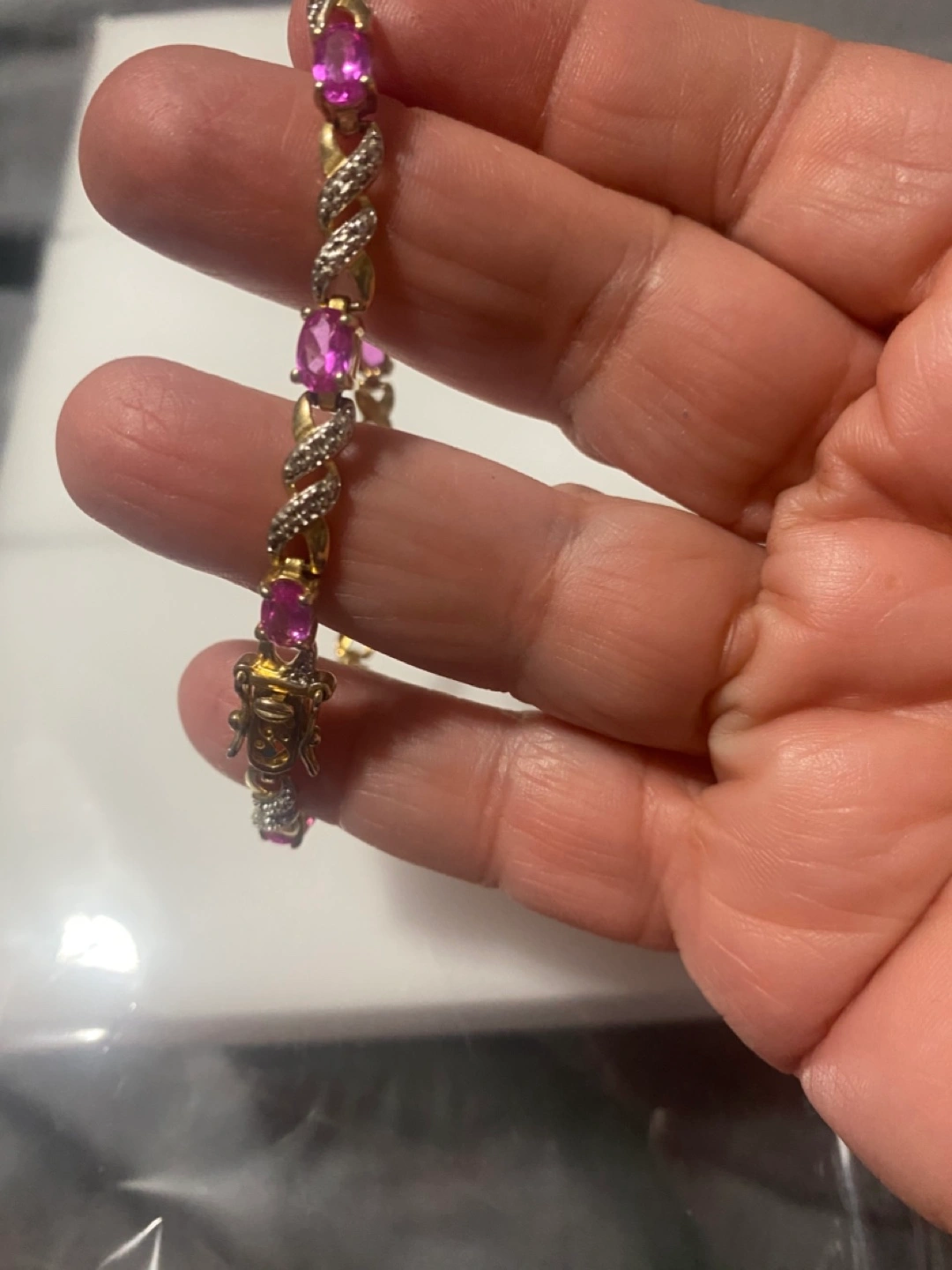 Selling a beautiful gold bracelet featuring pink gemstones. It's in great condition and would make a lovely addition to any jewelry collection