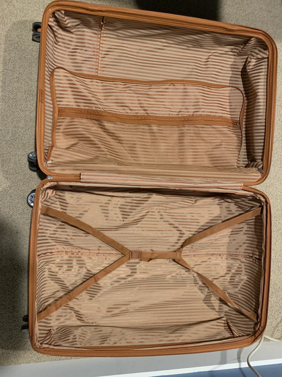 Classic black and tan full size London Fog suitcase. It's a hardside spinner with a durable exterior and a fully lined interior with tie-down straps. Plenty of space for all your travel essentials!