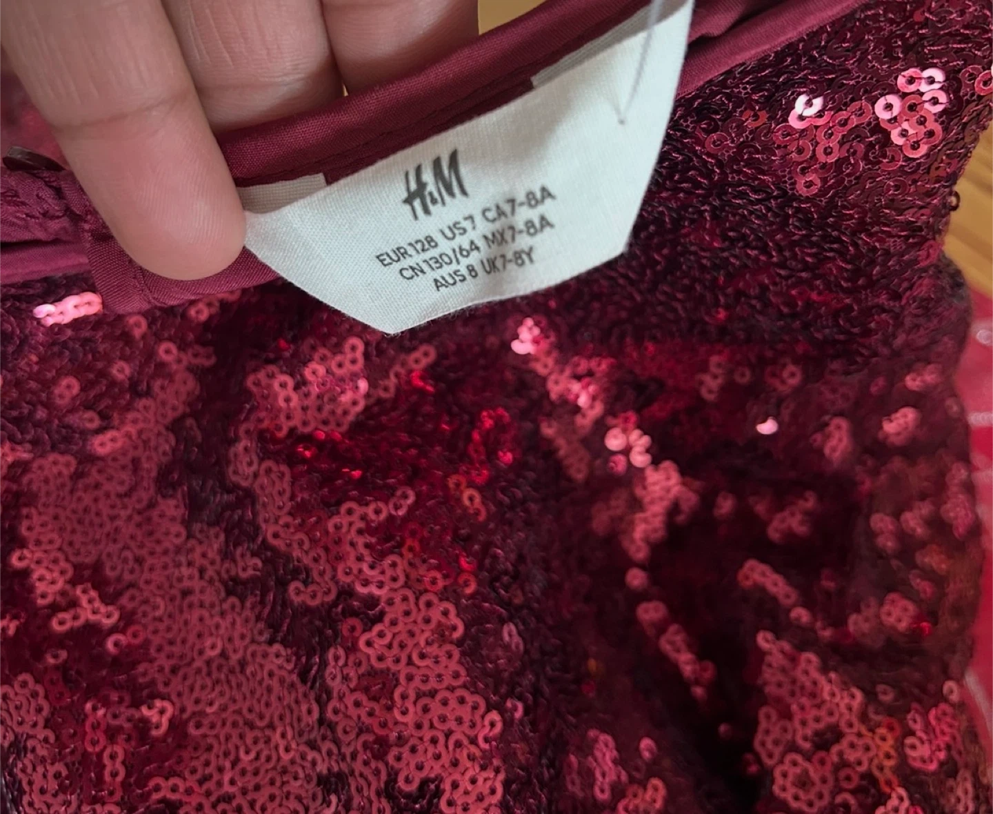 Sparkly burgundy sequin dress from H&M. It's a size 7-8 years, perfect for parties or special occasions! The dress has short flutter sleeves and a pull-on style with a back keyhole closure.
