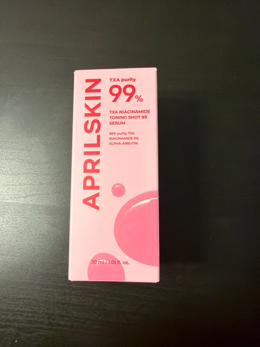 APRILSKIN TXA Niacinamide Toning Shot 99 Serum. 30ml (1.01 fl. oz.). Contains 99% pure TXA, niacinamide 5%, and alpha-arbutin. For skin brightening and toning.