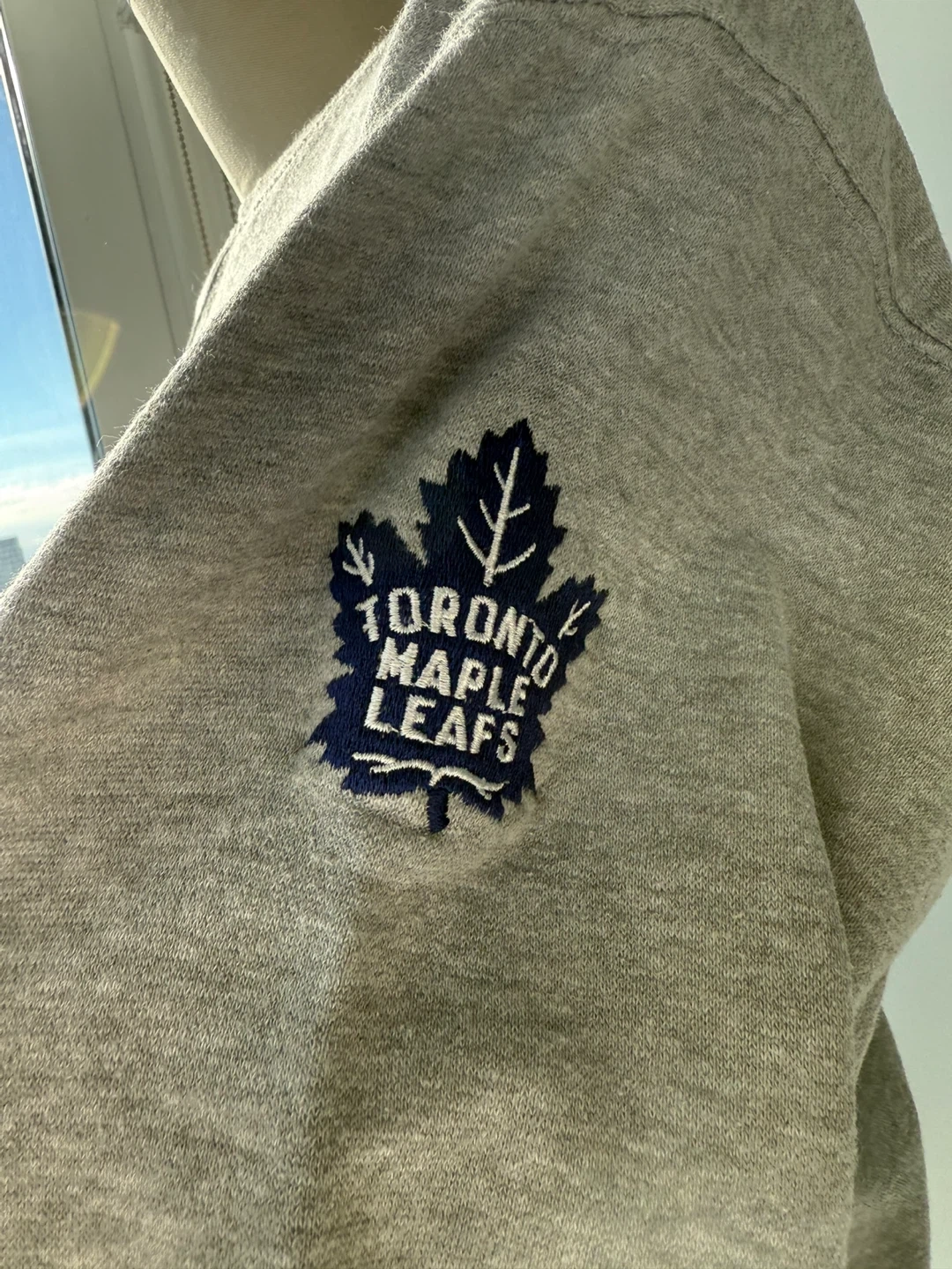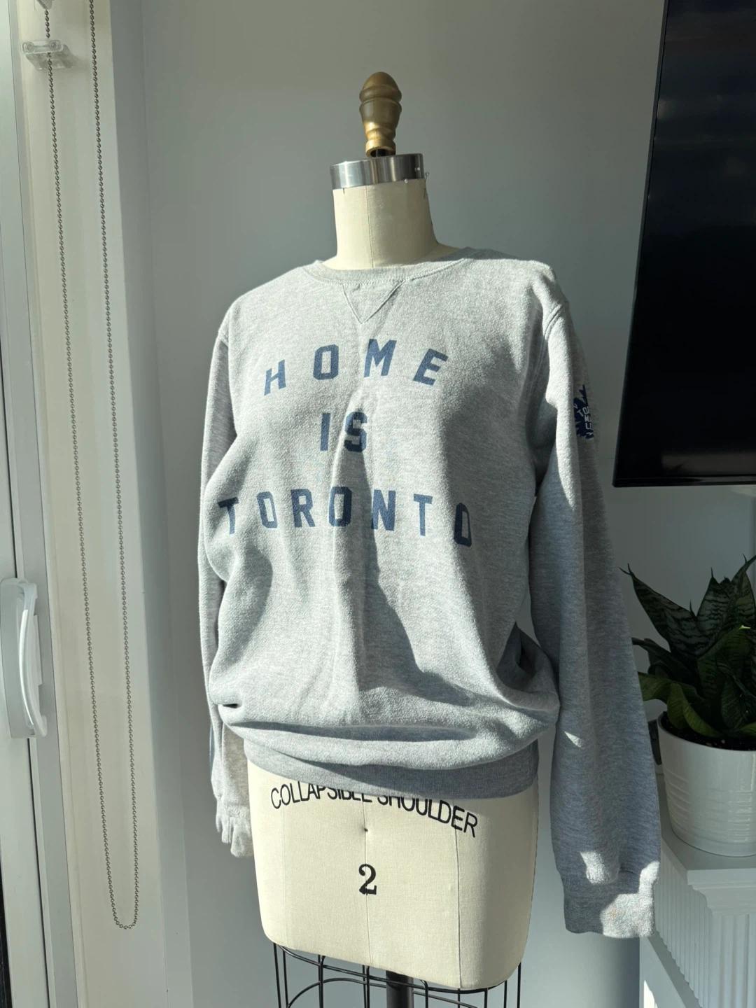 1000+Selling a grey Toronto Maple Leafs sweatshirt! It has the logo on the sleeve and "HOME IS TORONTO" printed on the front. There is a stain on the sleeve.
