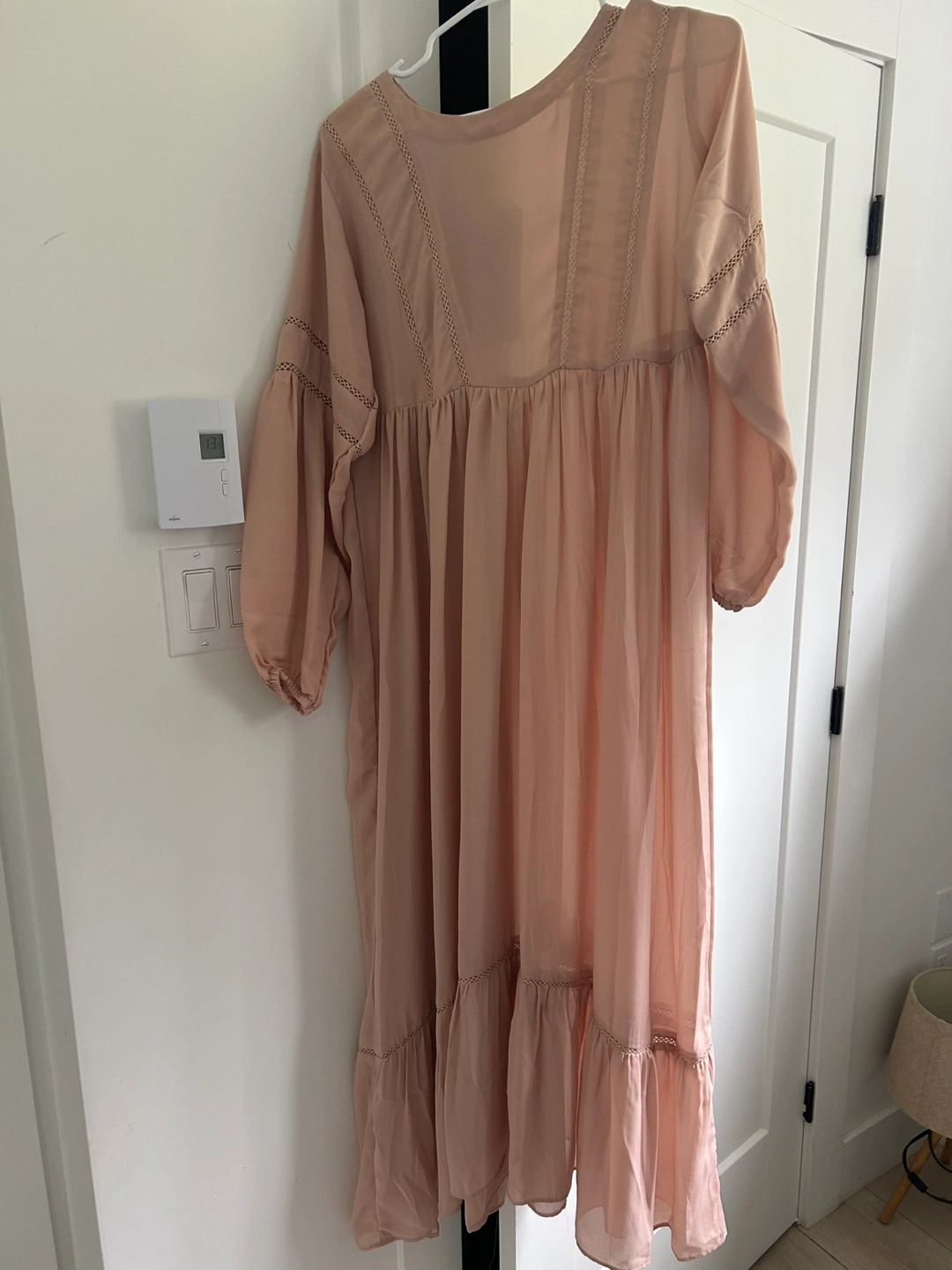 Selling a flowy peach-coloured dress! It's in great condition and has a lovely, relaxed fit. Perfect for a casual day out or a summer evening. It's a midi length with long sleeves and a tiered ruffle at the bottom.