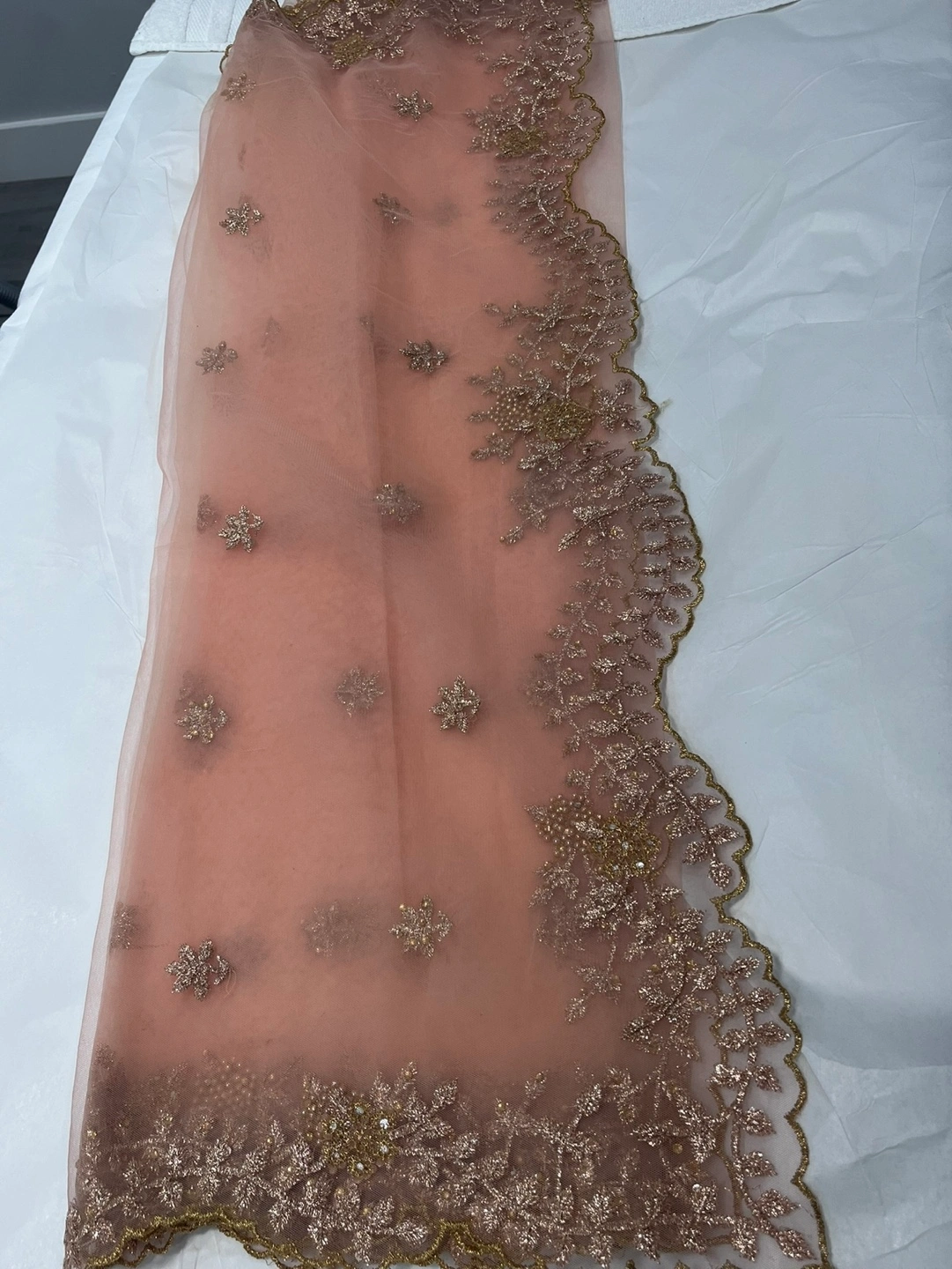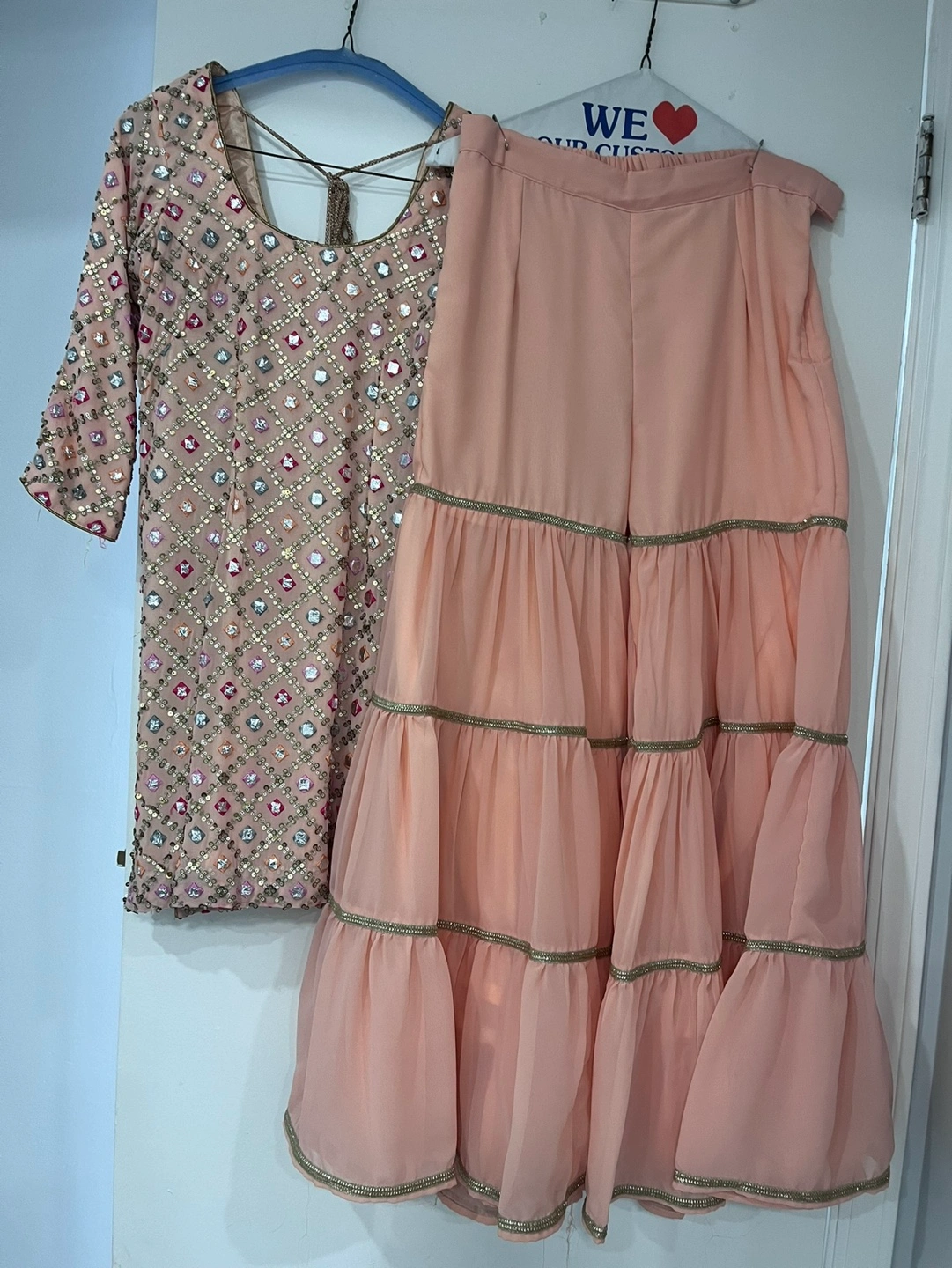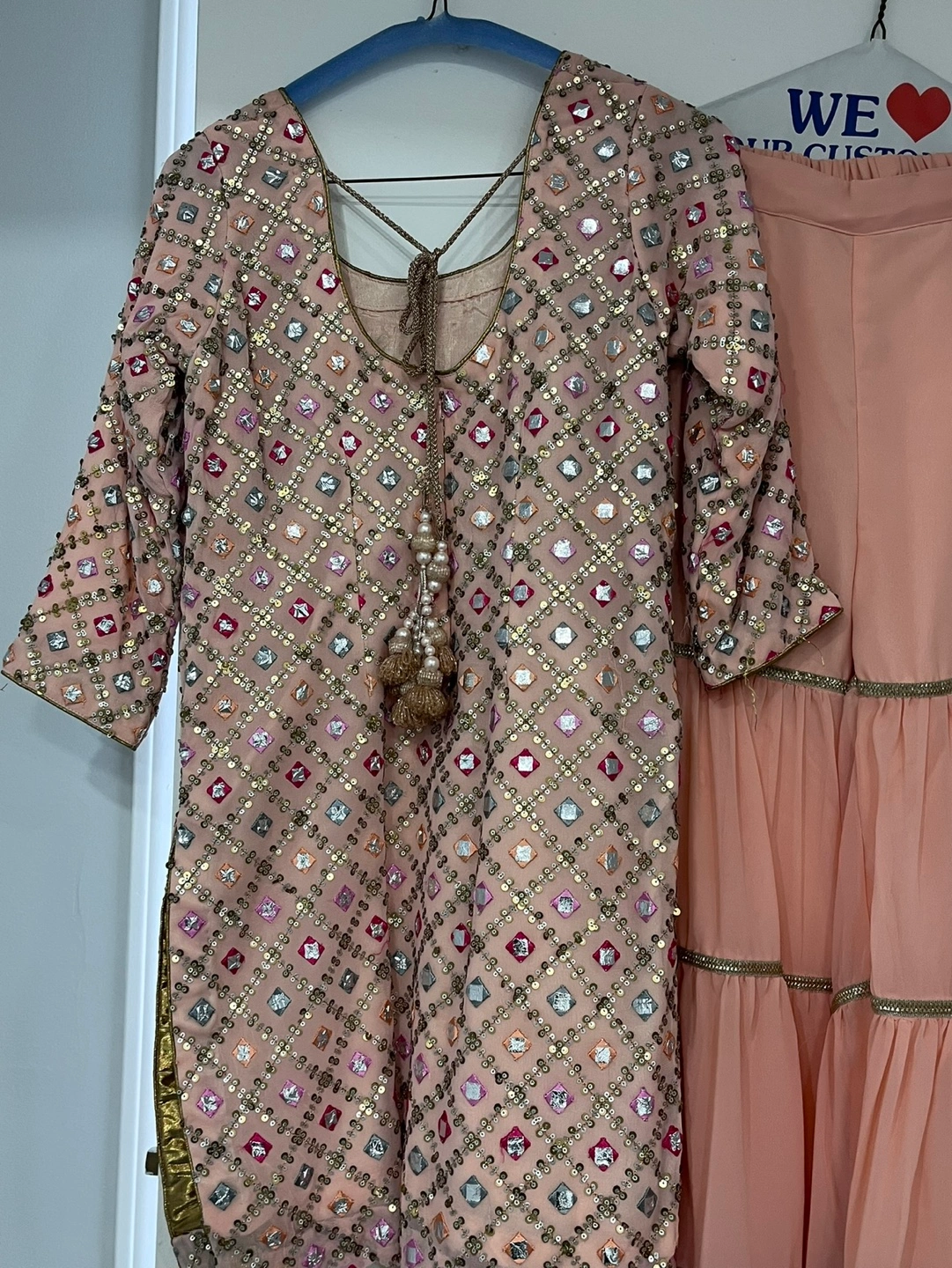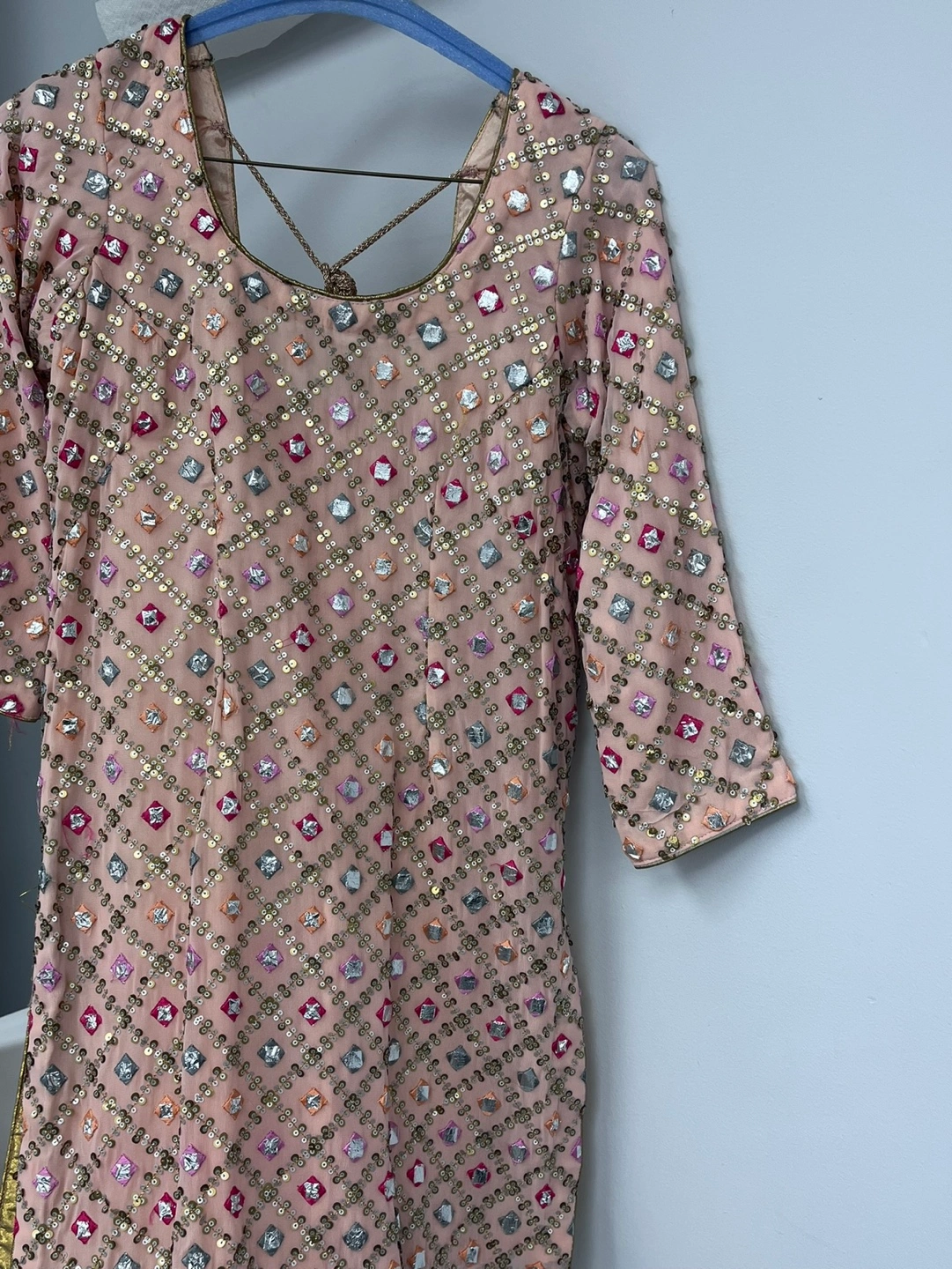 20Beautiful peach-coloured shalwar kameez. Features intricate mirror and sequin work. Includes a matching dupatta with embroidered border. Three-tiered palazzo-style shalwars. Gorgeous for special occasions.