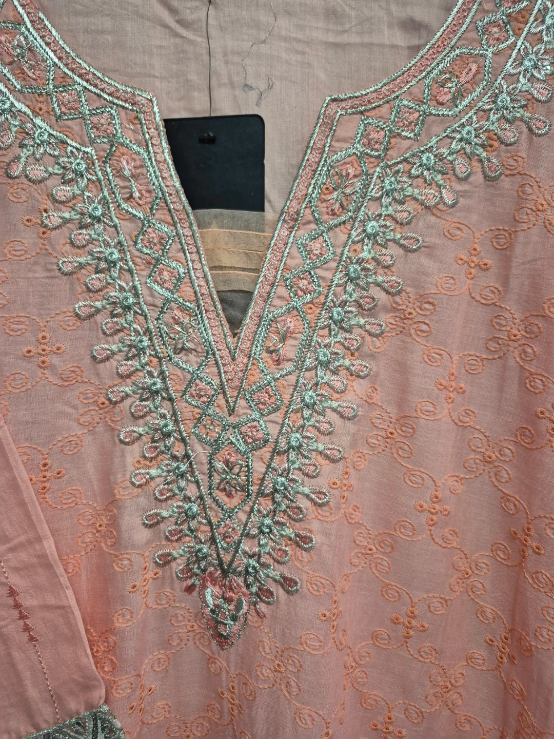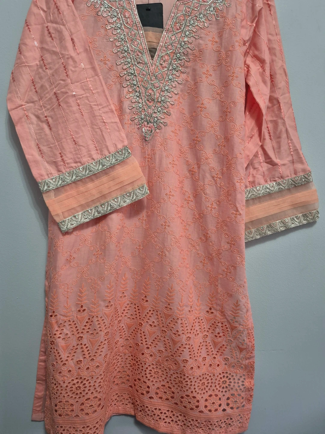 10Selling a beautiful peach coloured kurti with delicate embroidery. It's in great condition and perfect for a festive occasion or everyday wear! The intricate detailing around the neckline and sleeves adds a touch of elegance to this lovely piece