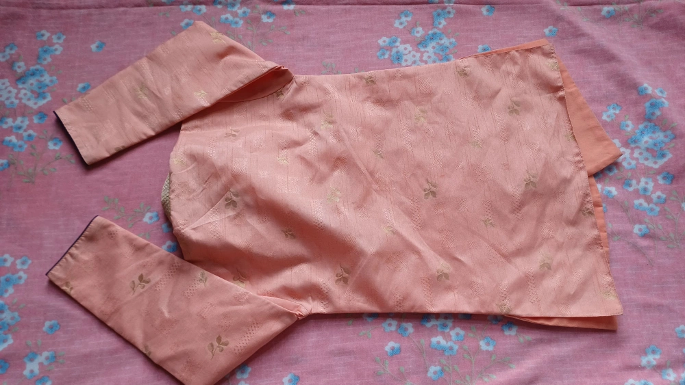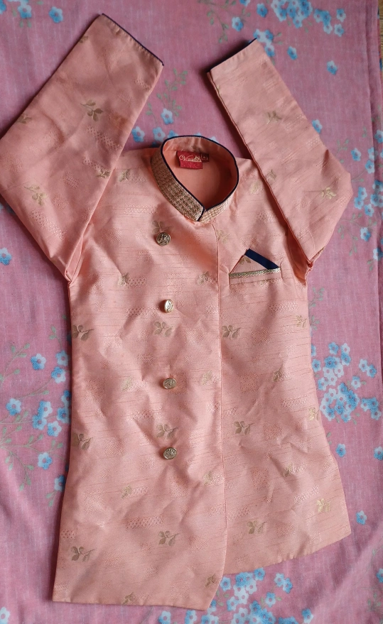 103Selling a cute peach-coloured kurta for kids! It's in great condition and perfect for special occasions or everyday wear. The fabric has a subtle pattern, and the design features a stylish collar and button details. It's a lovely addition to any child's wardrobe! Indian festive wear!6-7 years boys wear.