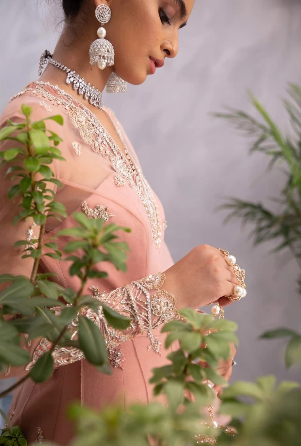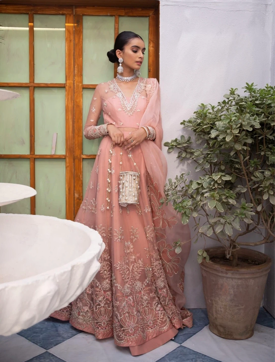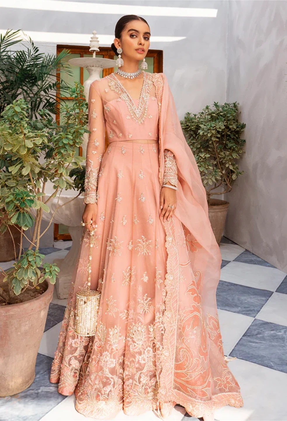 23Ready-to-Wear (4-pc) Inspired by the delicate Peruvian Lilies, this beautiful peace dress is as enchanting and as charming as its namesake. The net pishwas and lehnga are skilfully embellished with pearls and crystals, atop their peachy canvas. Complimenting the pair is a hand-worked organza dupatta with similarly alluring embellishments and floral patchwork, which only adds to its dreamy allure.