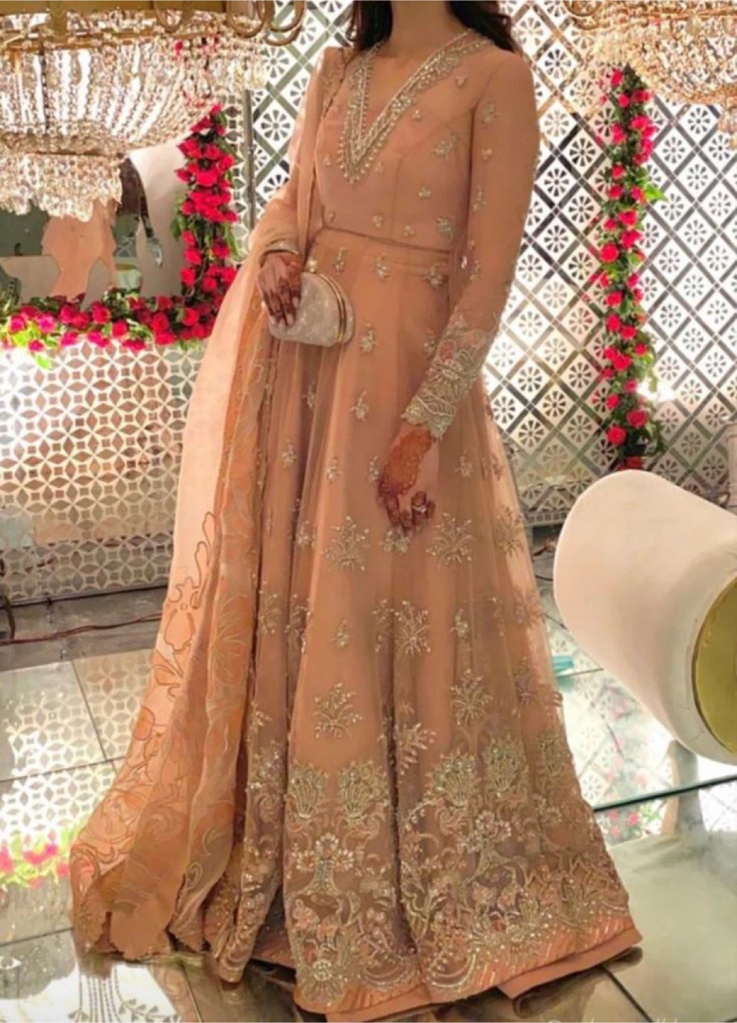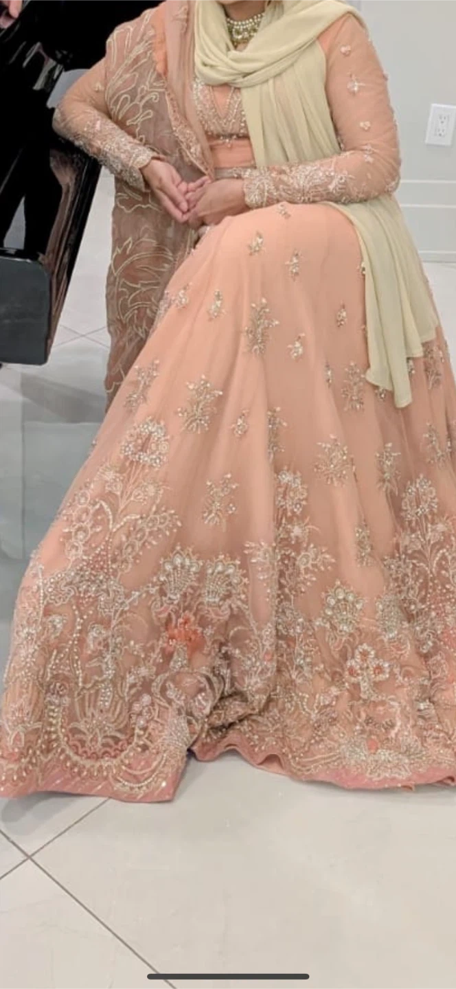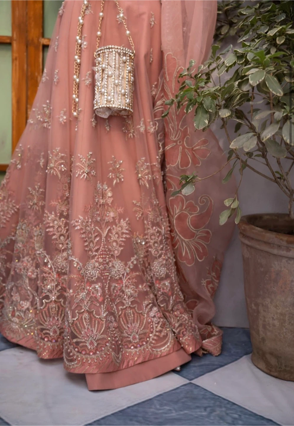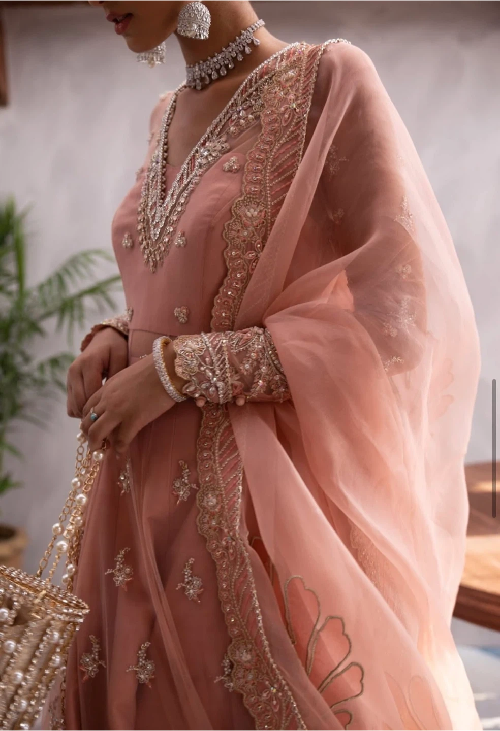 23Ready-to-Wear (4-pc) Inspired by the delicate Peruvian Lilies, this beautiful peace dress is as enchanting and as charming as its namesake. The net pishwas and lehnga are skilfully embellished with pearls and crystals, atop their peachy canvas. Complimenting the pair is a hand-worked organza dupatta with similarly alluring embellishments and floral patchwork, which only adds to its dreamy allure.