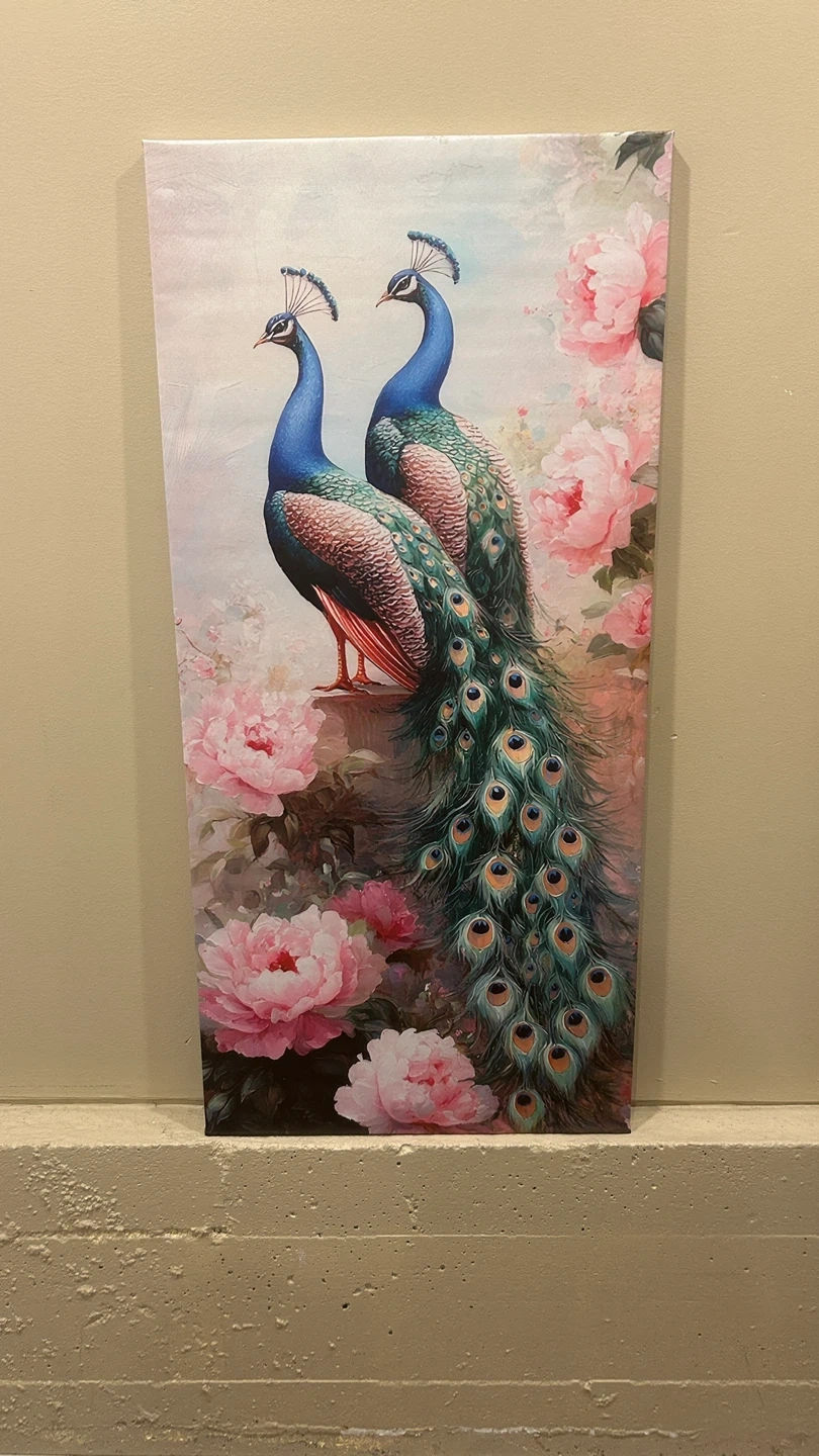 Beautiful canvas art featuring peacocks and peonies! It's in great condition and would look lovely in any room. 17.5 x 36.75 inches