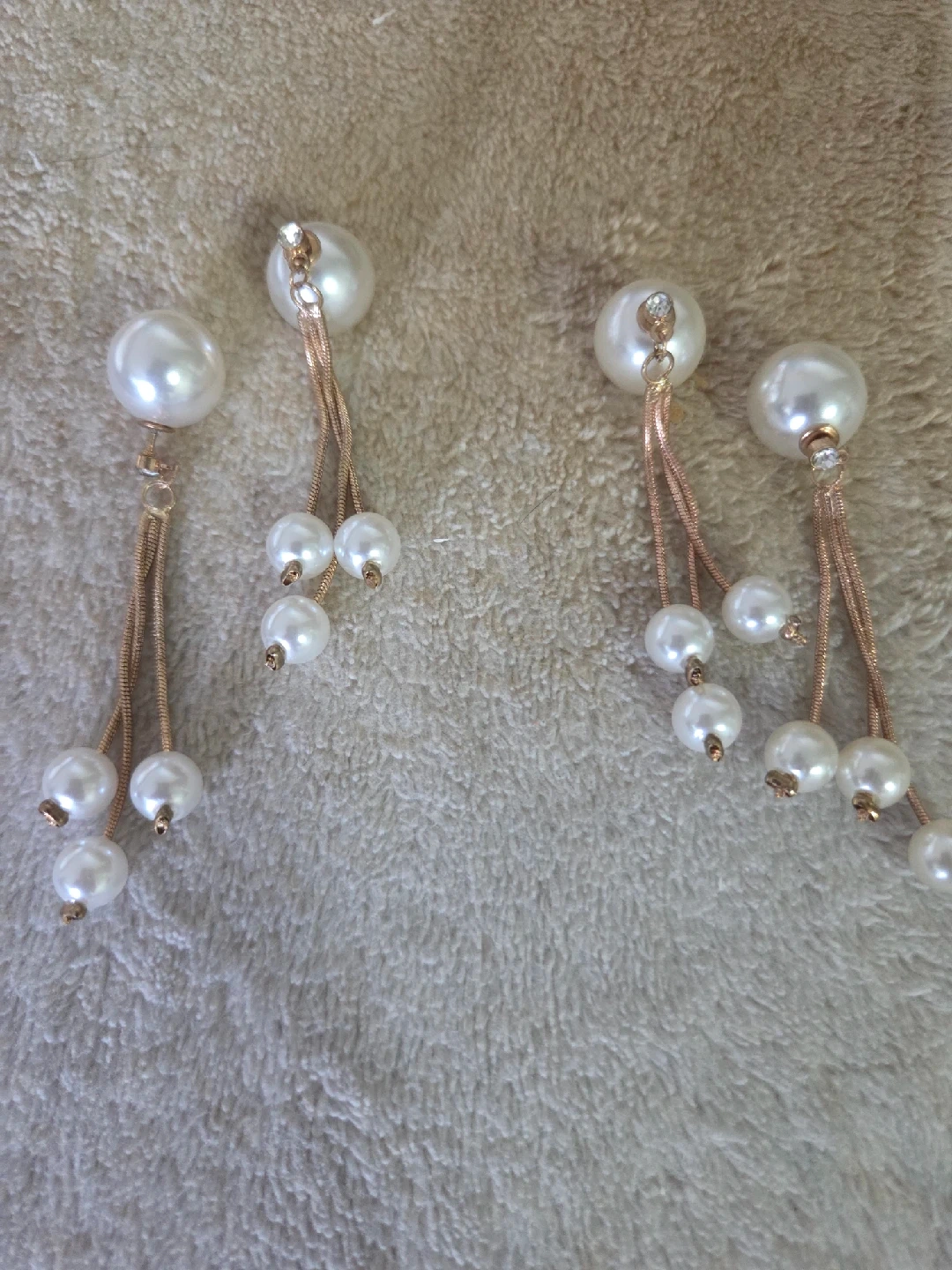 60Selling a pair of elegant pearl drop earrings. These earrings feature a larger pearl stud with a dangling chain of smaller pearls. Perfect for adding a touch of sophistication to any outfit!