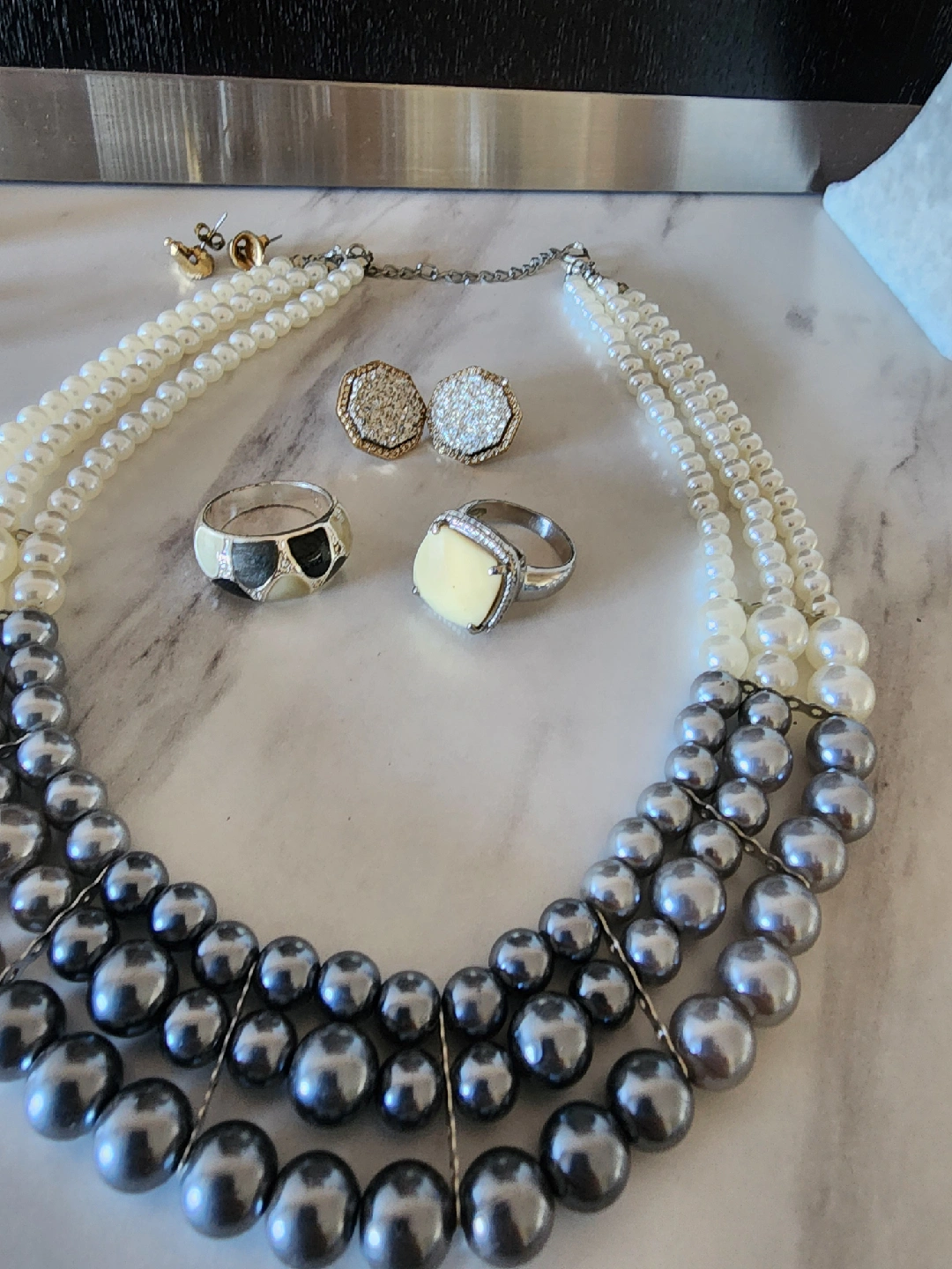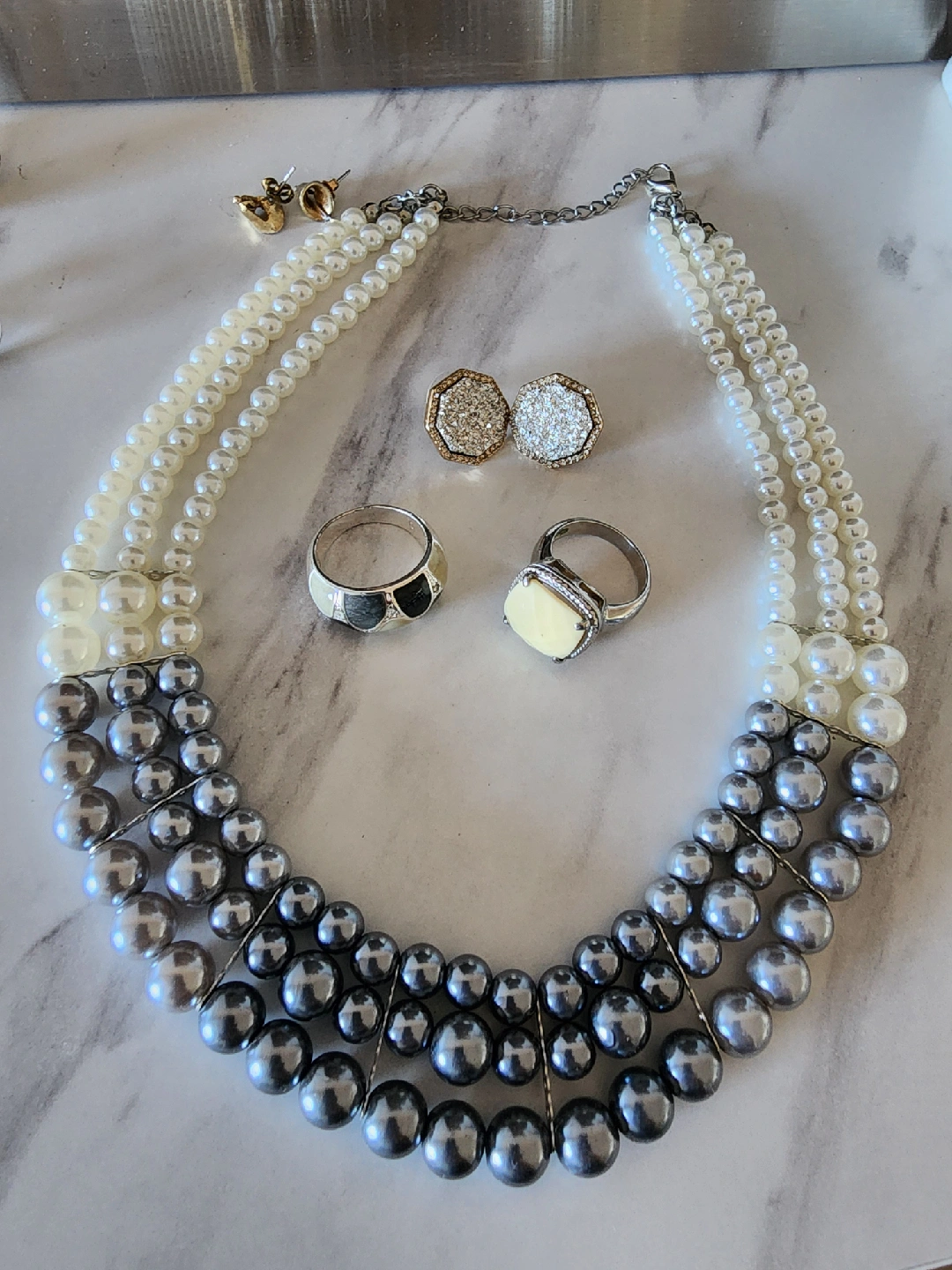 Selling a beautiful pearl necklace with matching rings. The necklace features a multi-strand design with white and grey pearls. The rings complement the necklace perfectly. Great for adding a touch of elegance to any outfit!