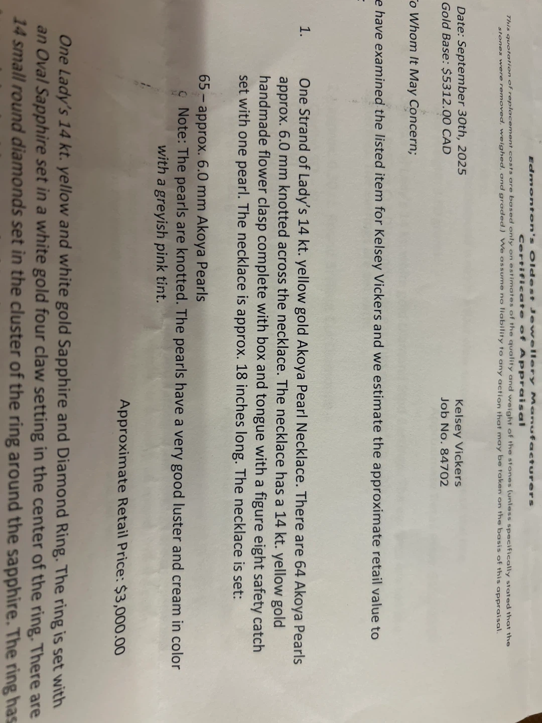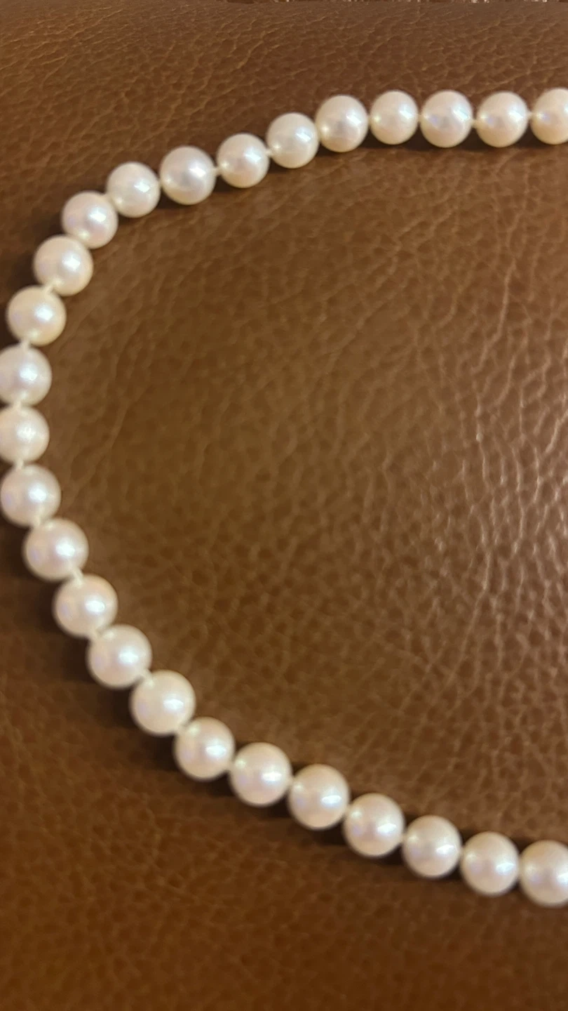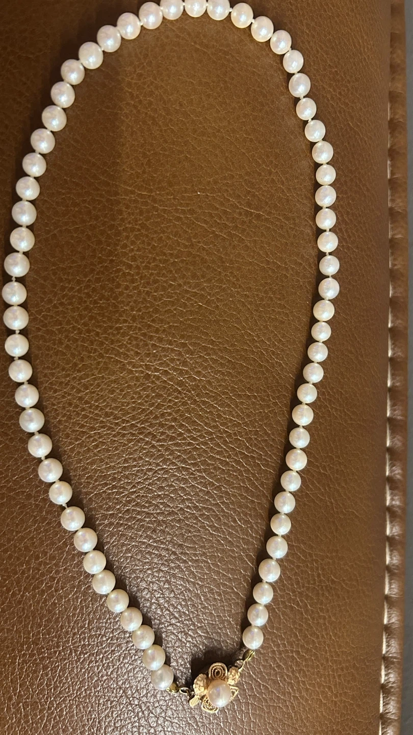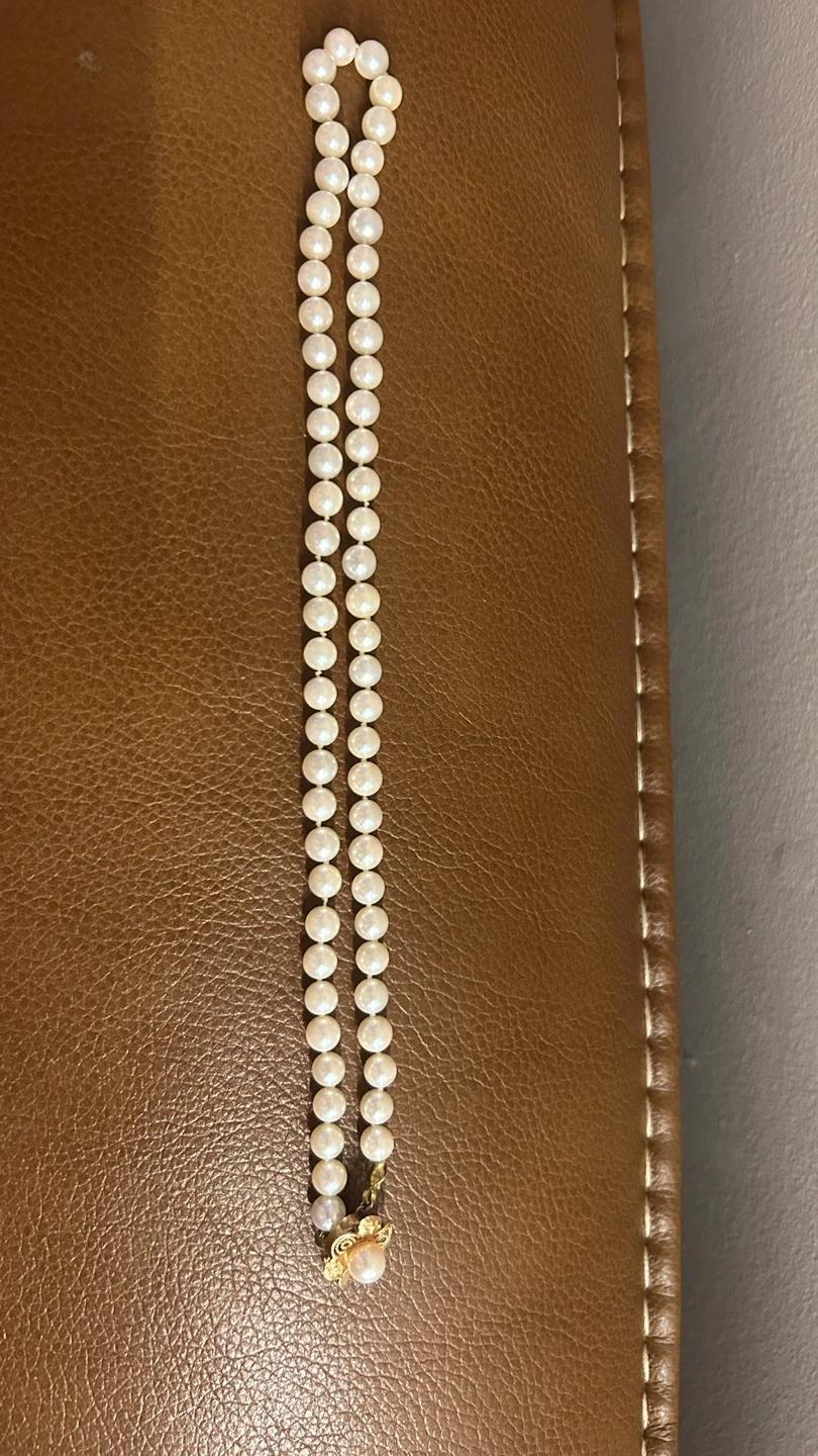 10One strand of ladies 14kt yellow gold Akoya pearl necklace. Handmade flower clasp. 65 6.0 mm Akoya Pearls. The pearls have a very good luster and cream in colour with a greyish pink tint