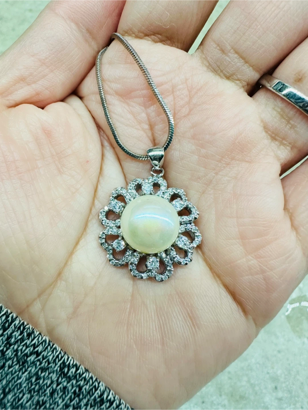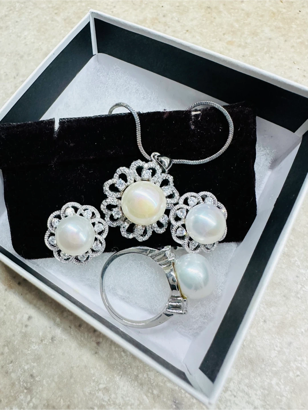 19Here's a lovely set including a pearl necklace and matching earrings! The set features a floral design with silver-tone metal and pearl accents. It's in great condition and comes in a box for safekeeping