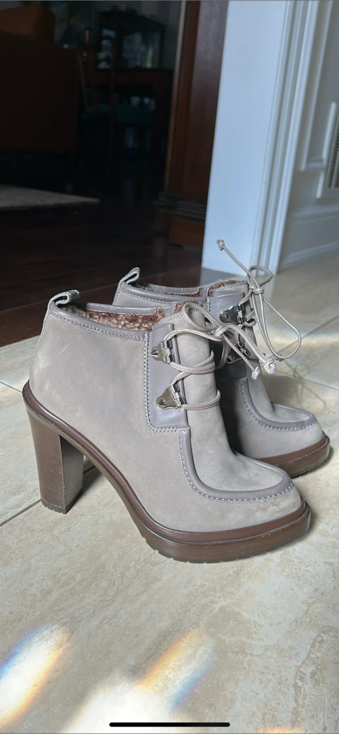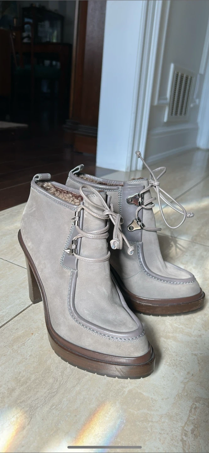 Selling a pair of Sergio Rossi ankle boots in a lovely grey colour! They have a unique lace-up design and a comfortable heel height. Perfect for adding a touch of elegance to any outfit