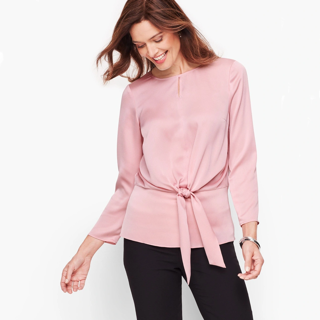 This silky Talbots top cinches your waist with a self-tie belt, flattering your waistline flawlessly for an elegant silhouette and fit.