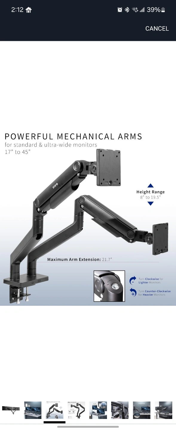 VIVO Heavy Duty Dual Ultra-Wide Monitor Desk Mount. Mechanical spring height adjustable stand for 2 ultrawide screens up to 45 inches. 20kg capacity per arm. Black. STAND-V200D. Features integrated cable management.
