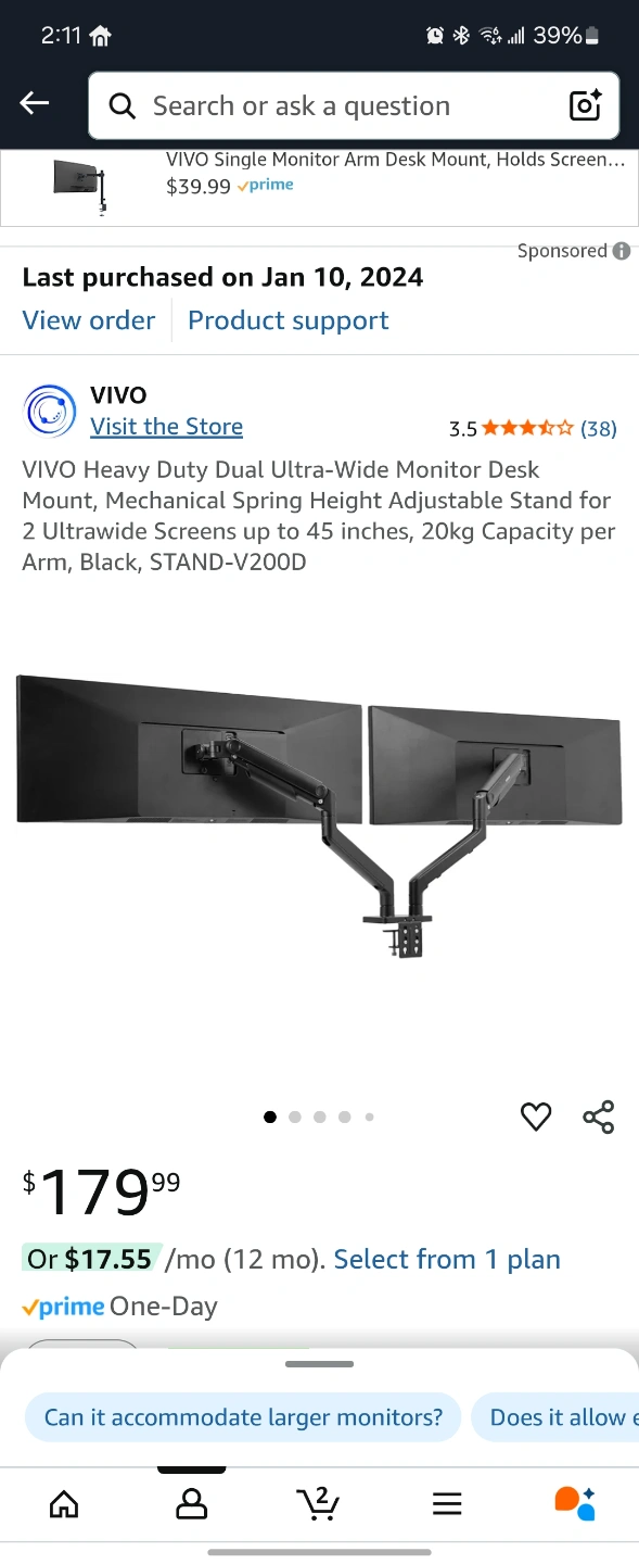 VIVO Heavy Duty Dual Ultra-Wide Monitor Desk Mount. Mechanical spring height adjustable stand for 2 ultrawide screens up to 45 inches. 20kg capacity per arm. Black. STAND-V200D. Features integrated cable management.