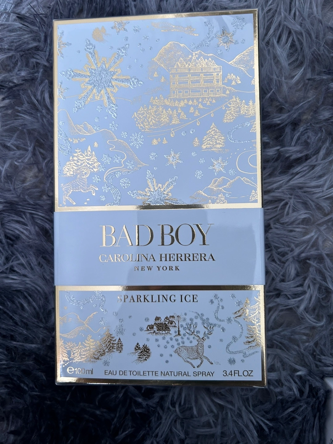 Brand new, unopened 3.4 fl oz bottle of Bad Boy Sparkling Ice by Carolina Herrera. Winter-themed packaging. Eau de toilette natural spray.