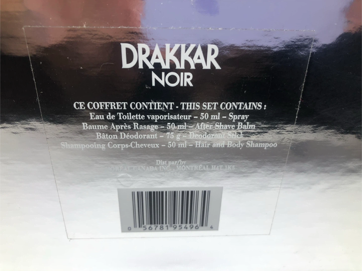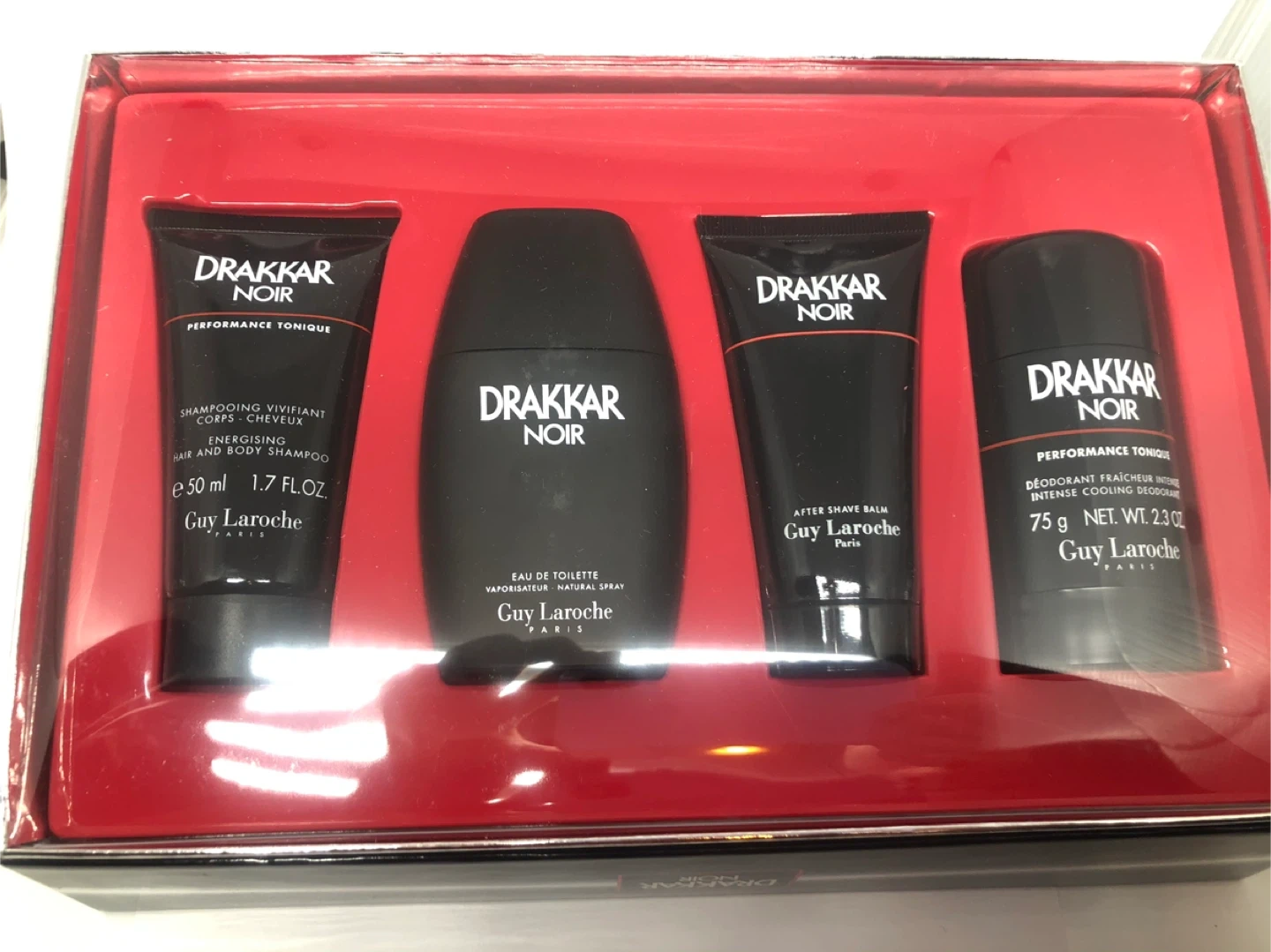 Vintage Drakkar Noir gift set includes Eau de Toilette spray (50ml), After Shave Balm (50ml), Deodorant Stick (75g), and Hair and Body Shampoo (50ml). All products are from the Drakkar Noir line by Guy Laroche. This set is suitable for anyone looking for a complete grooming experience.