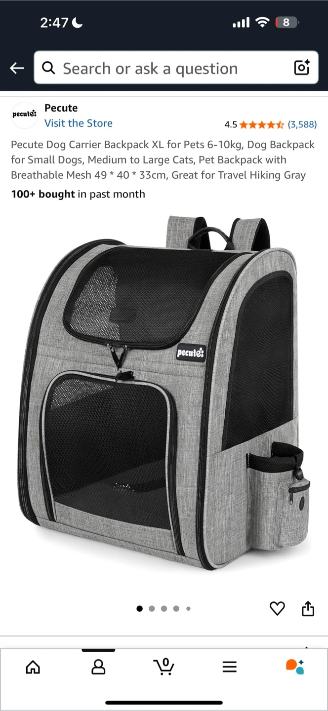 Purchased off Amazon. Recipient bought another one before I could give this to them. Missed the return date Pecute dog/pet carrier backpack in XL size. It's in gray and is perfect for small to large cats and dogs up to 10kg. The breathable mesh design ensures your pet stays comfortable during travel or hiking. The dimensions are 40L x 33W x 49H cm.