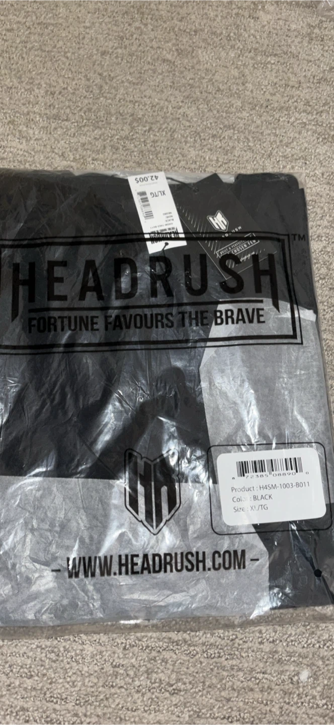 HEADRUSH black t-shirt with a cool graphic print on the front. It's a size XL/TG. Made from comfortable fabric. Great for casual wear!
