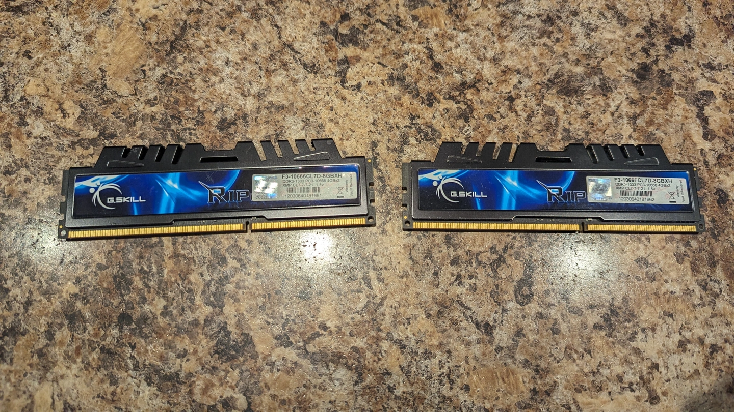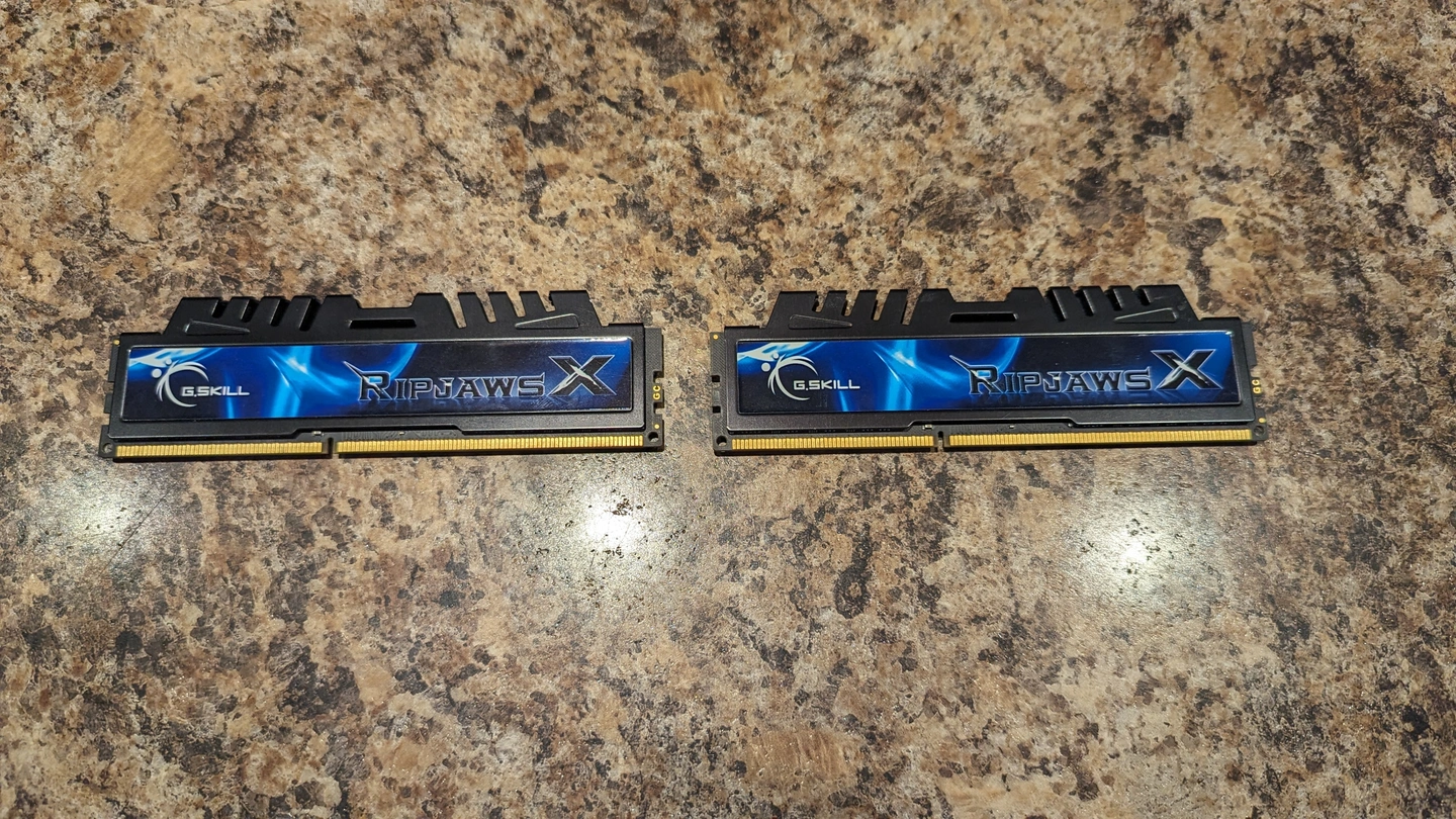 G.Skill RipjawsX DDR3 RAM. Used, in good working condition. Comes as a set of 2 sticks, DDR3 desktop memory, tested and working. Great for upgrading an older Intel or AMD system. $31 CAD.