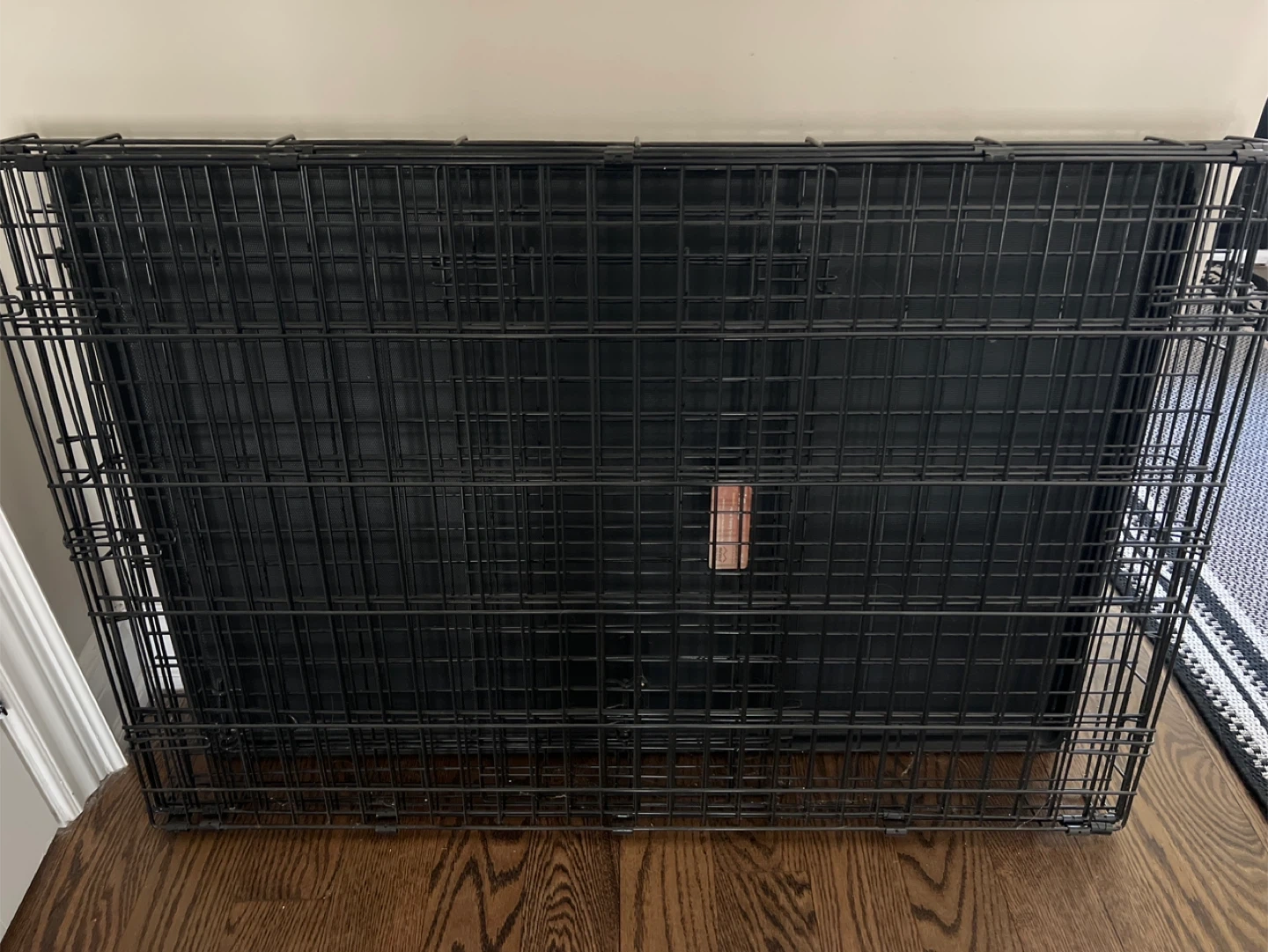 Black wire dog crate with a removable plastic tray. It's a sturdy and durable option for your pet. Great for indoors, outdoors training or travel! Folds flat. 2 doors.