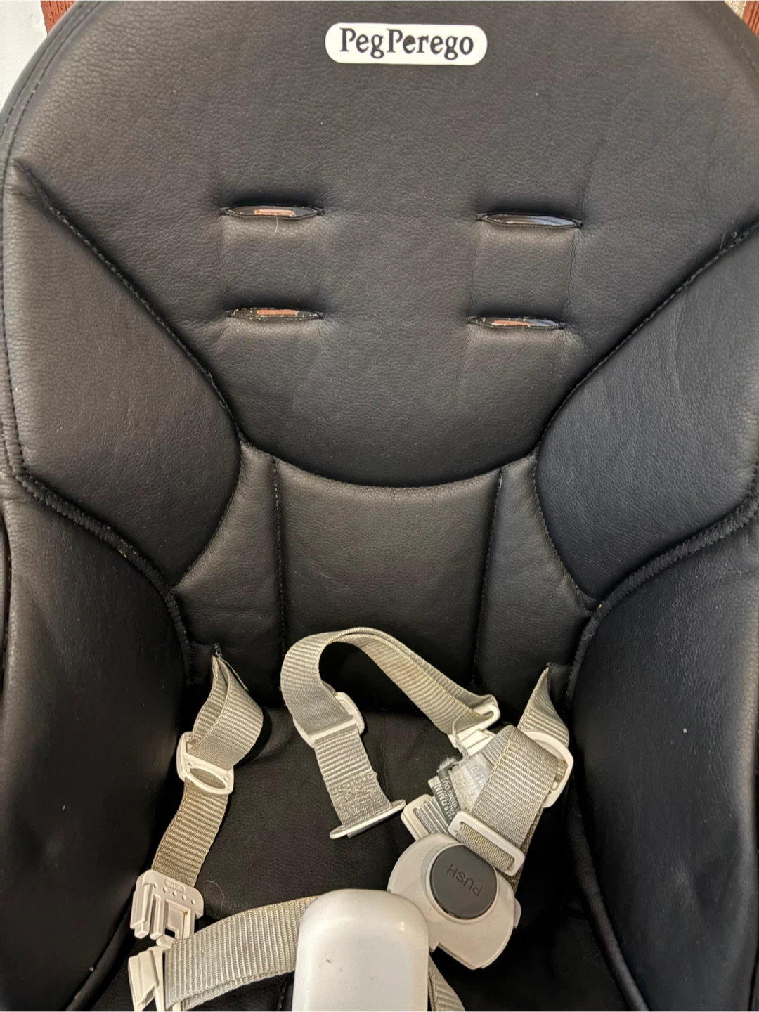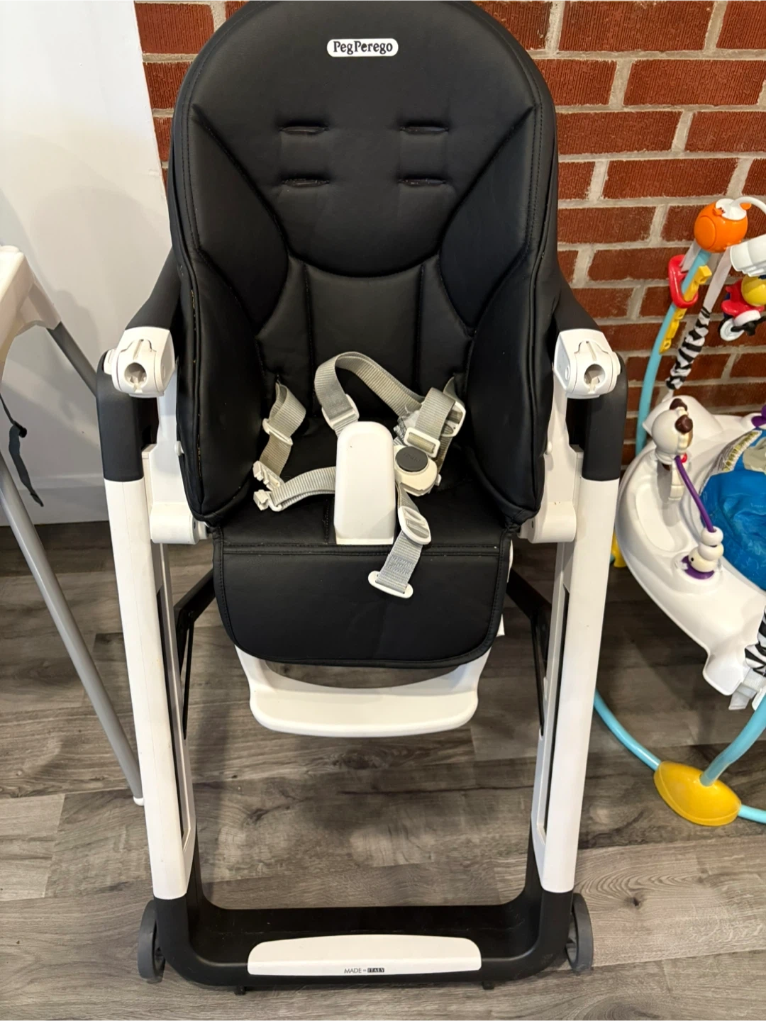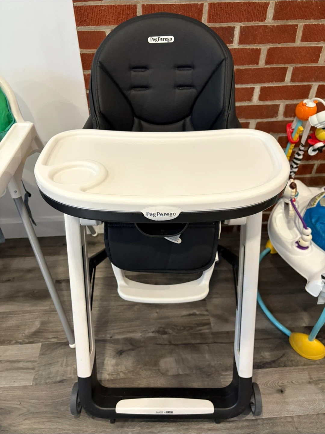 5Selling a Peg Perego high chair in black. It's in good condition and ready for a new home. Only used for a month, everything is clean and works perfectly. Has both trays, my son was just too small for it.