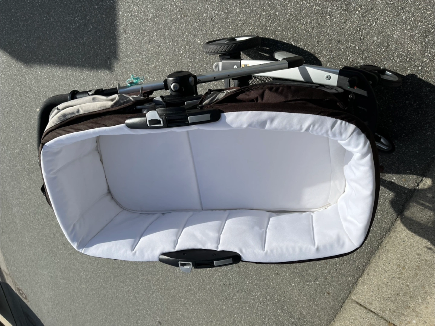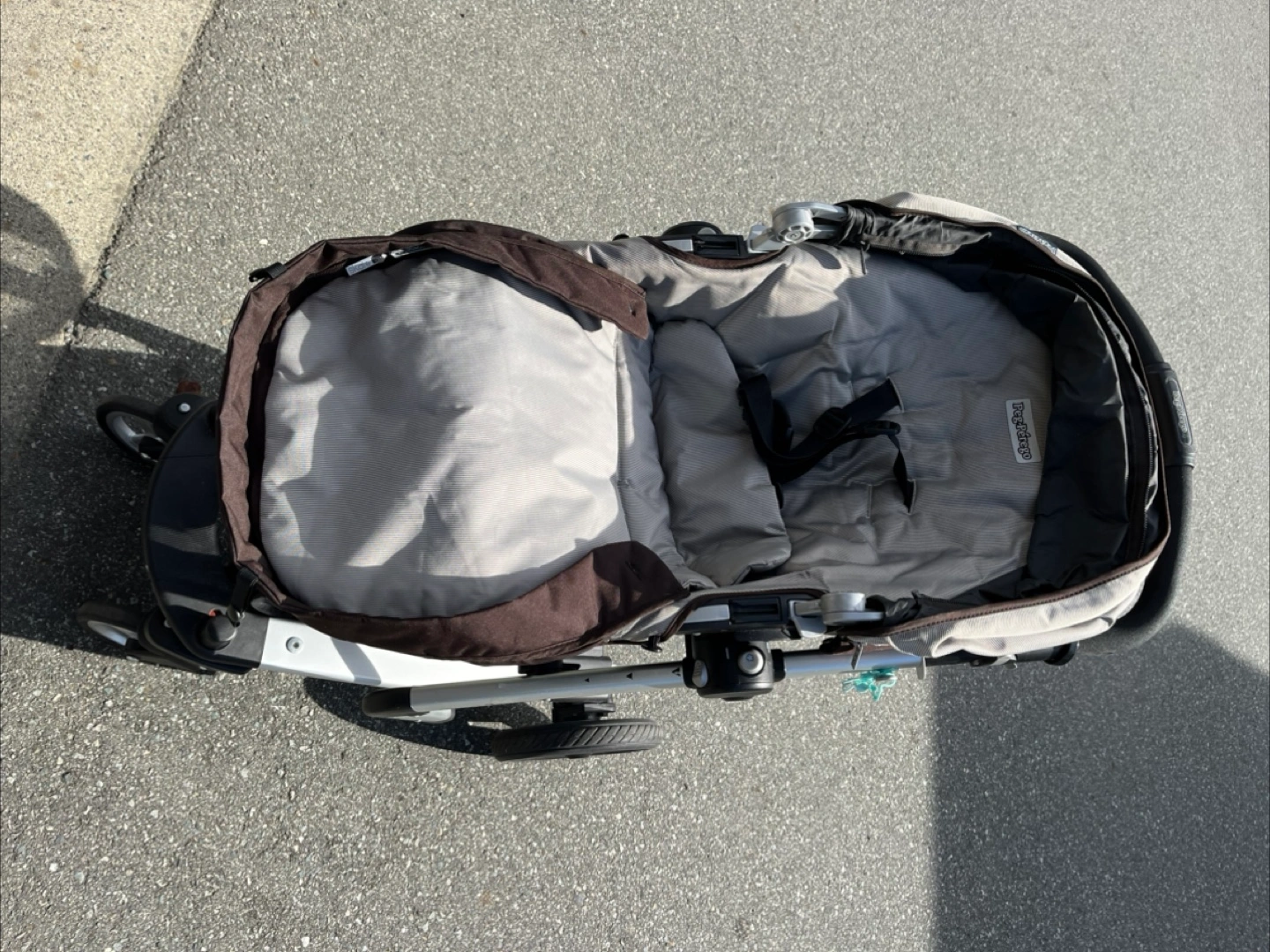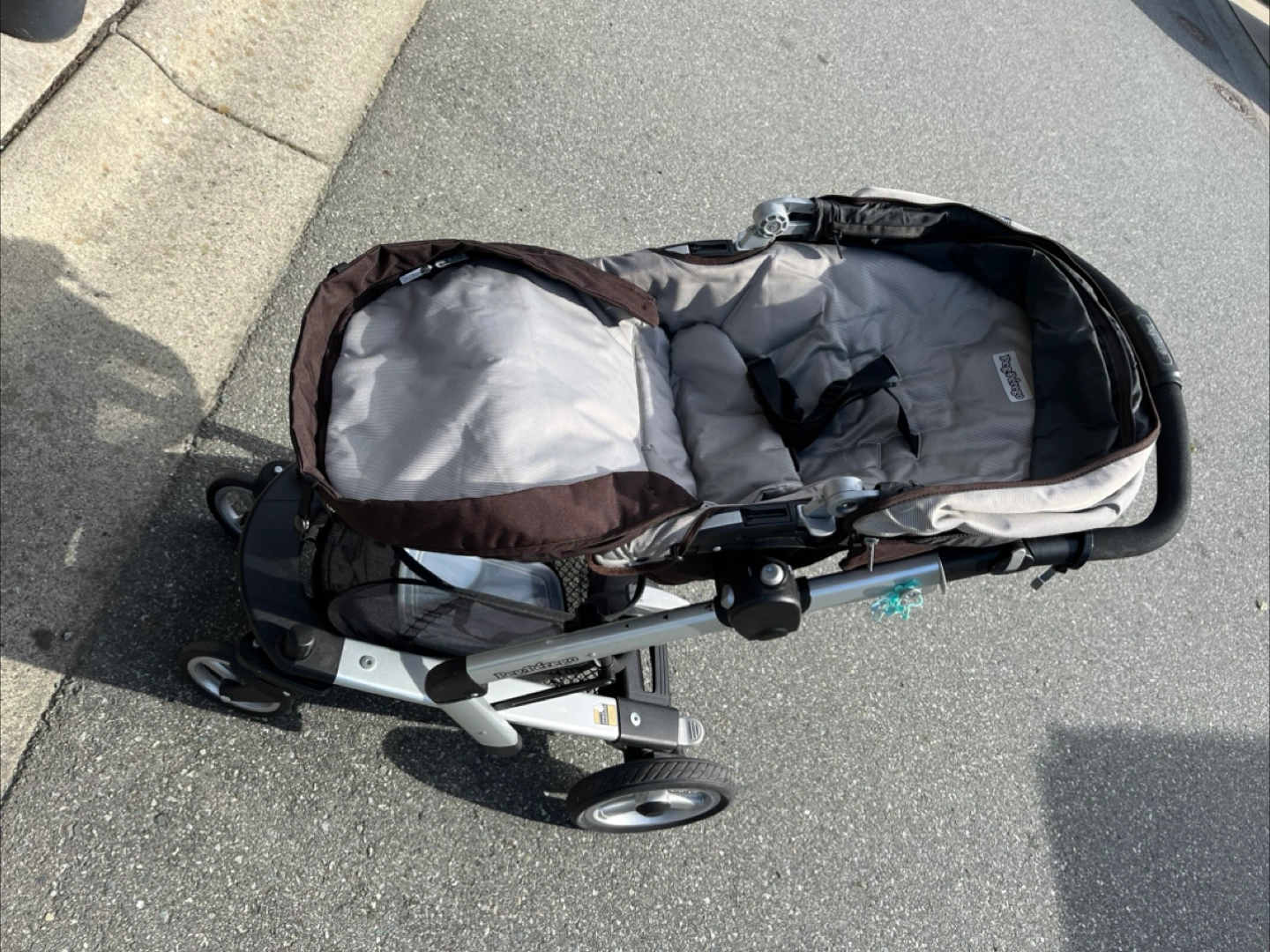 55Grey and brown colour scheme. Infant car seat and stroller. Good used condition.