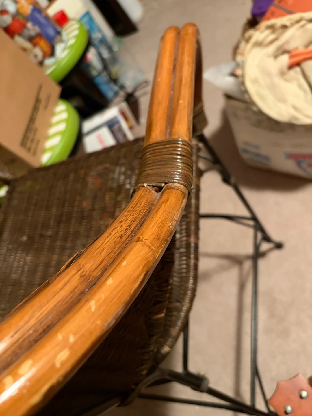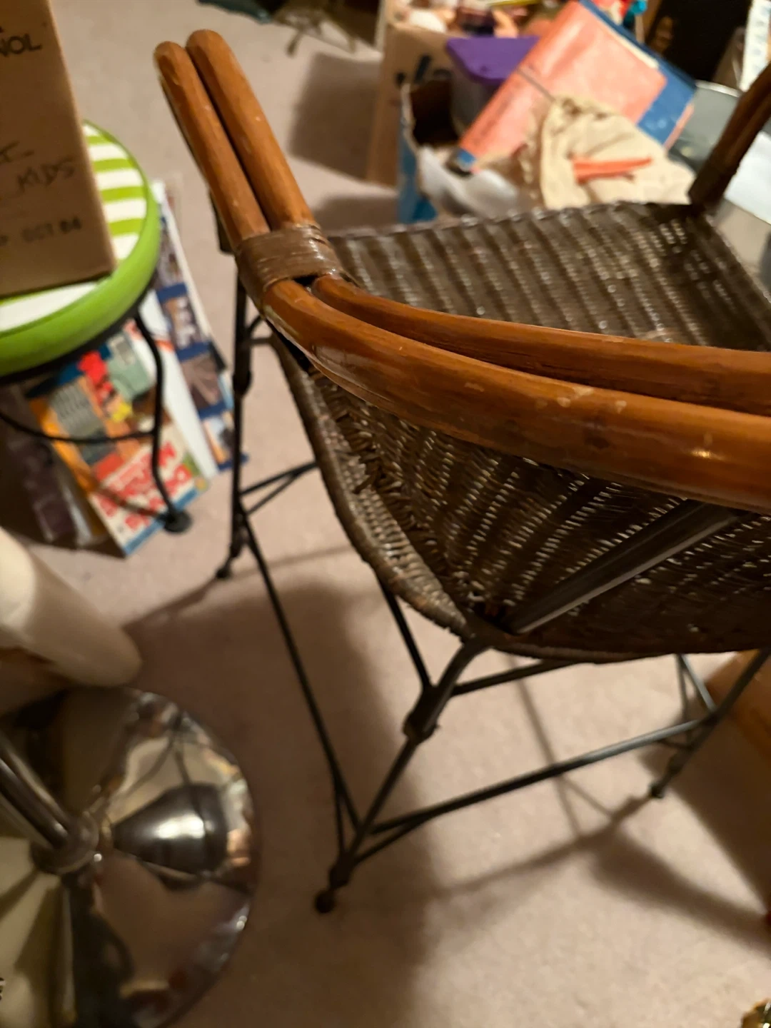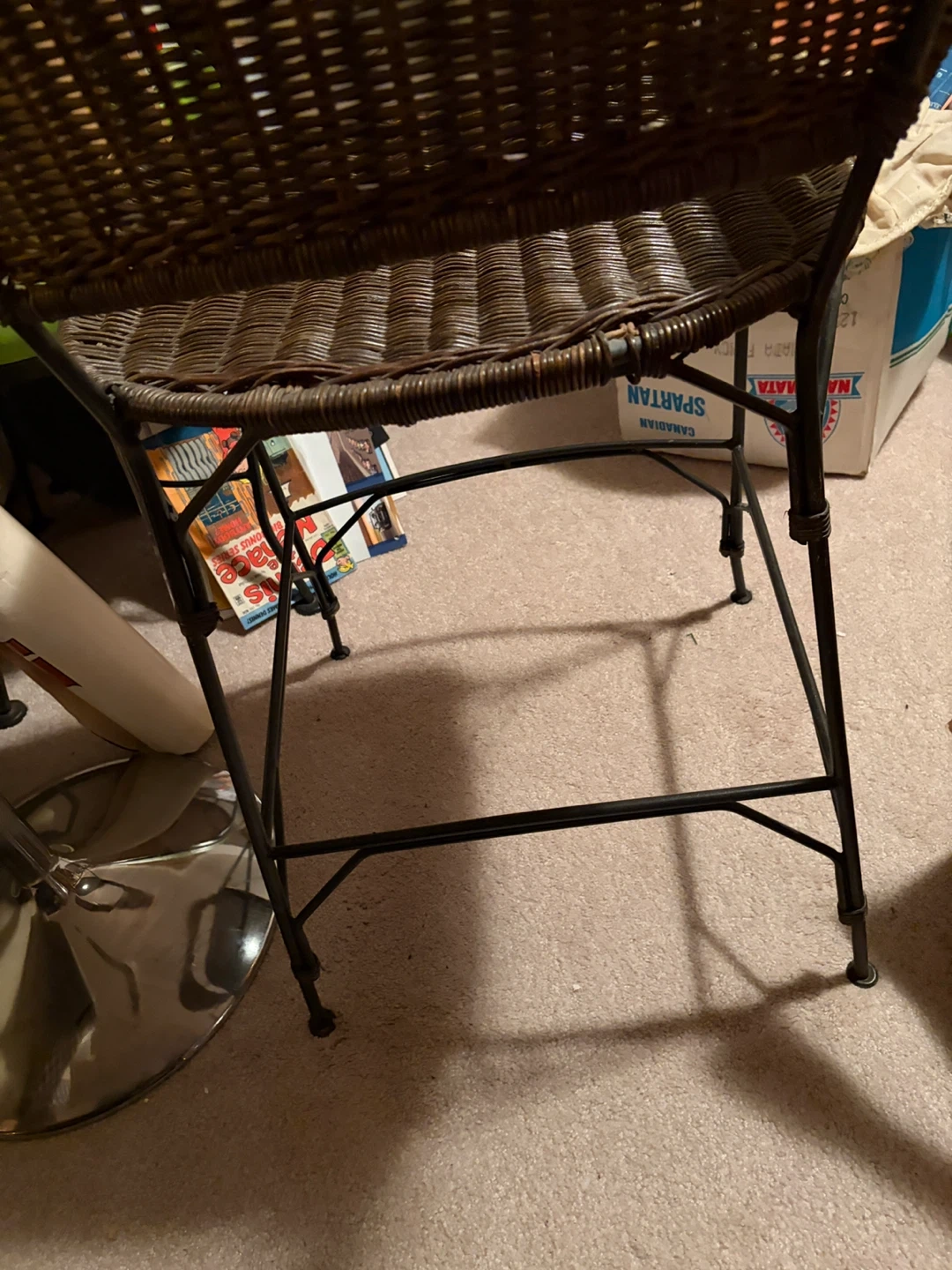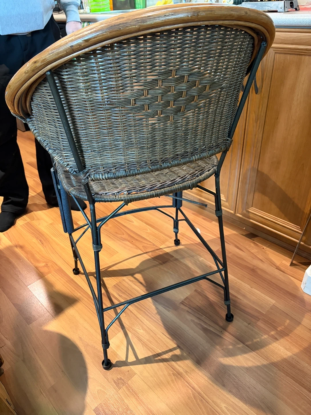 2 sturdy bar stools featuring woven wicker construction and a smooth wooden top trim. Its metal legs provide a stable base. This stool's classic design fits well in kitchen or bar areas.