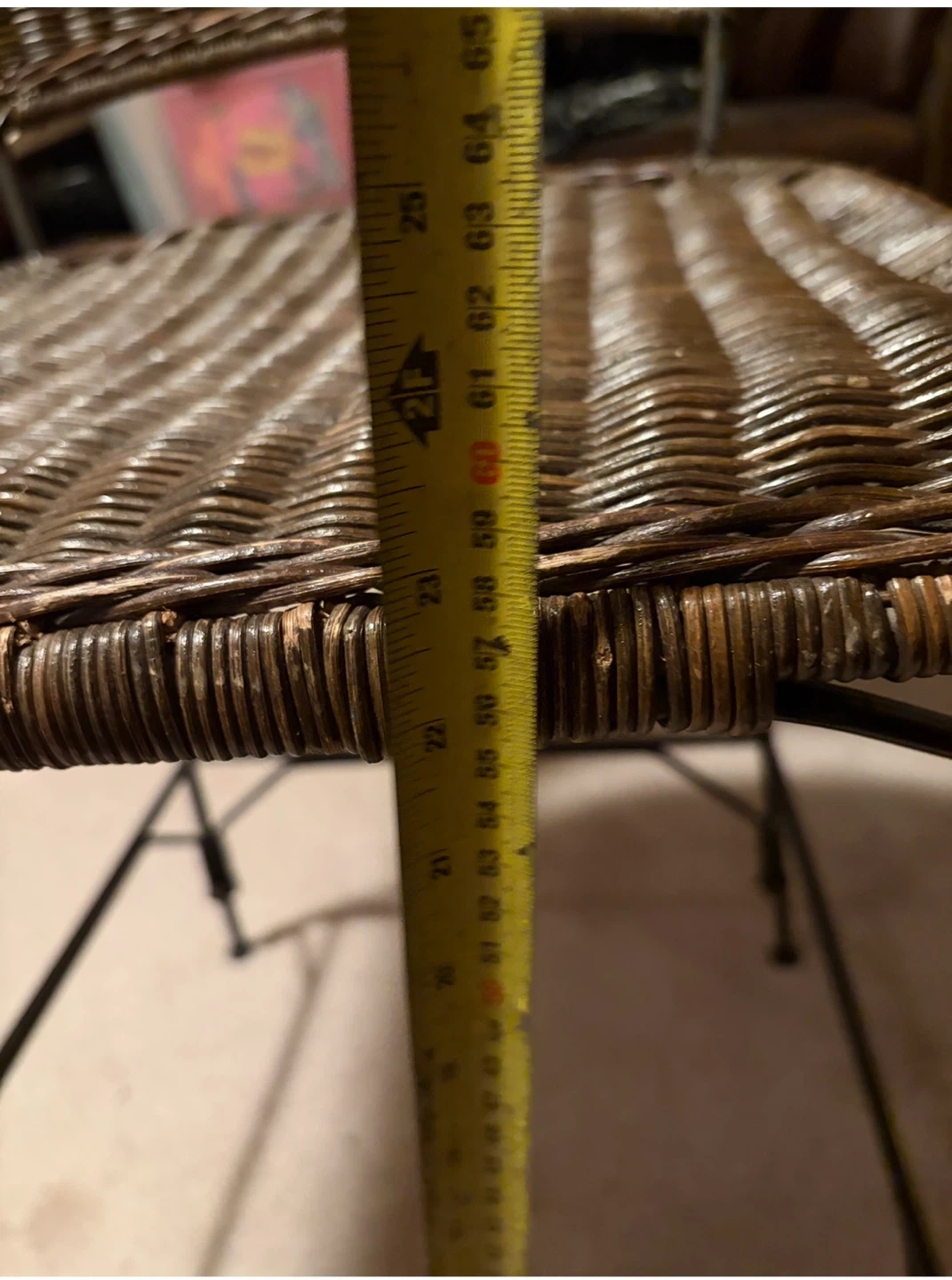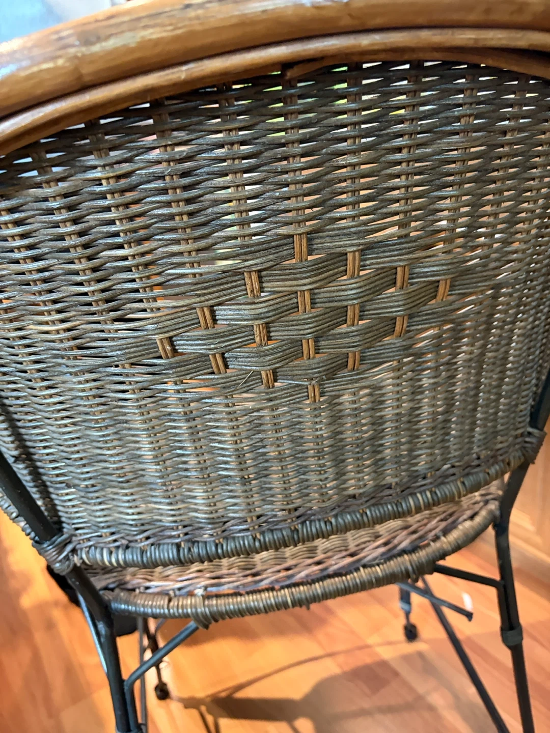 2 sturdy bar stools featuring woven wicker construction and a smooth wooden top trim. Its metal legs provide a stable base. This stool's classic design fits well in kitchen or bar areas.