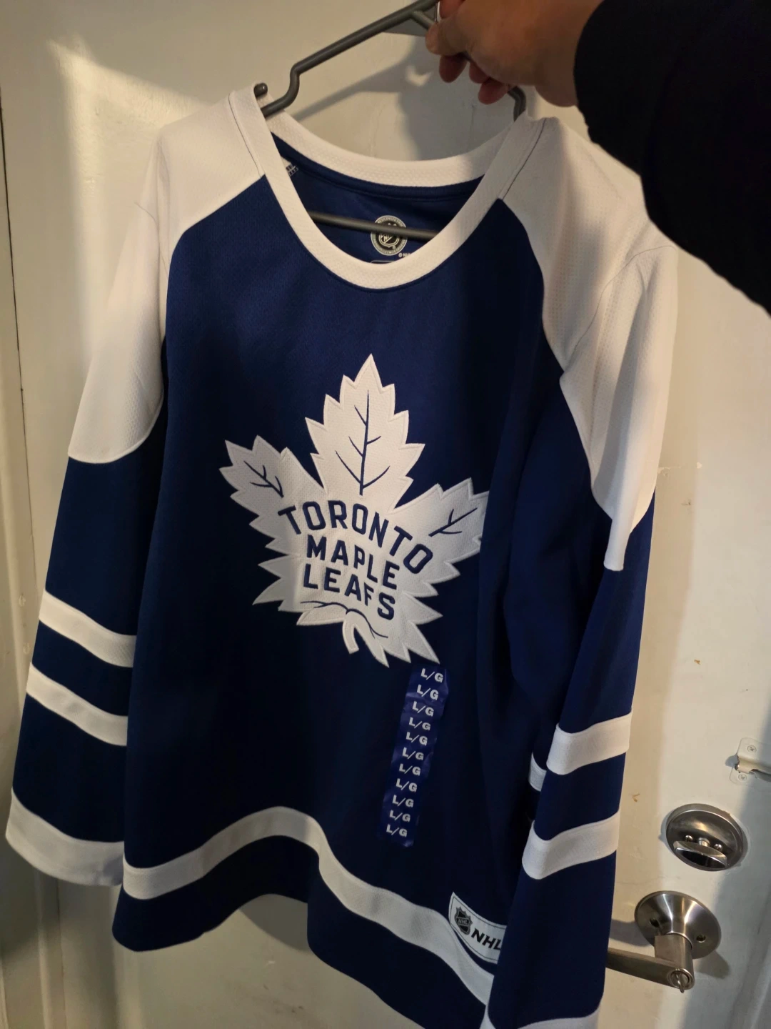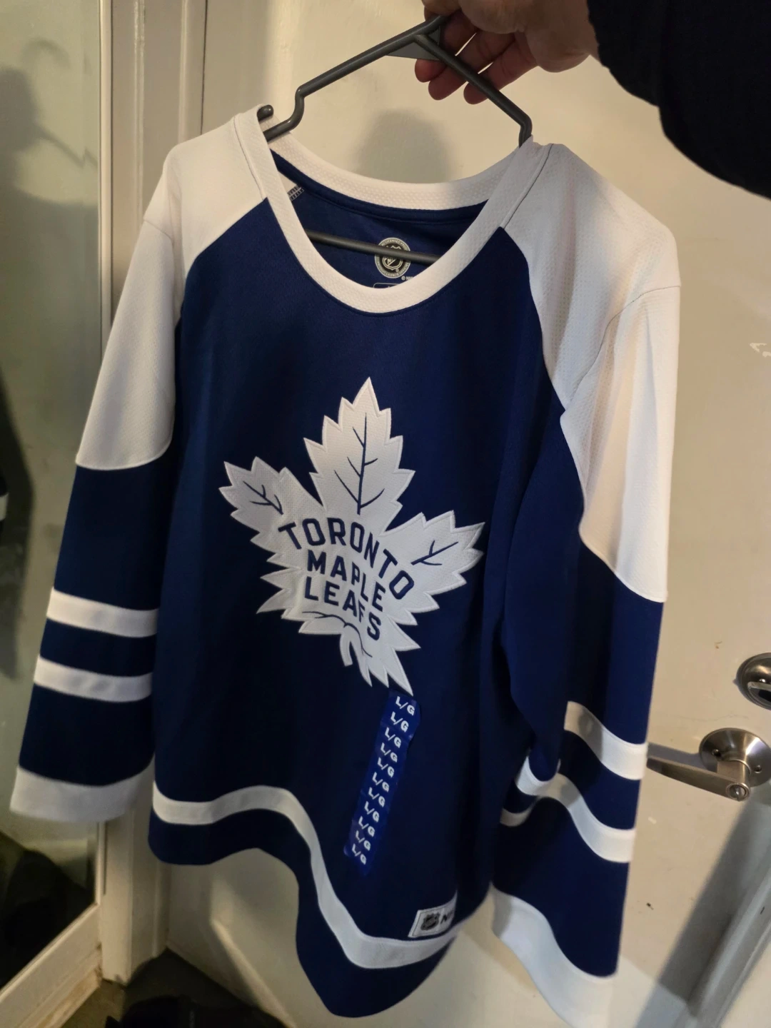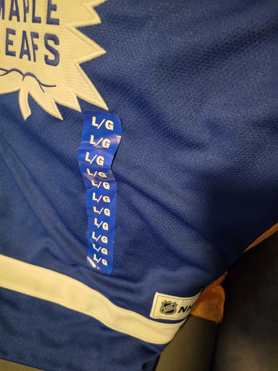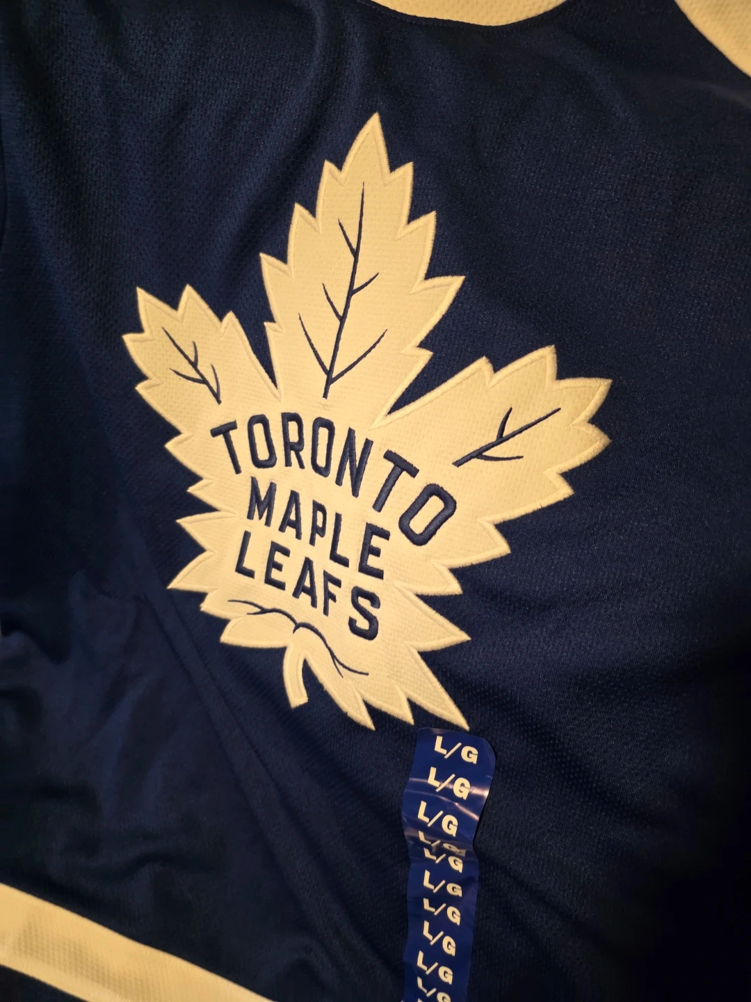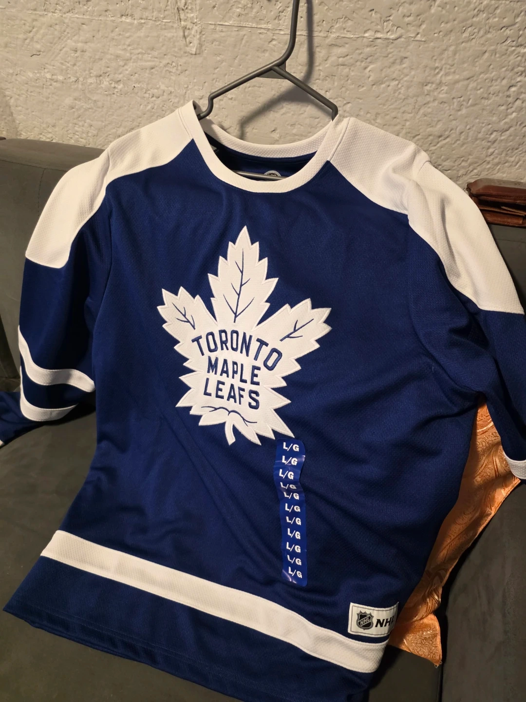 A Toronto Maple Leafs hockey jersey for fans. It's a size L/G and features the team's iconic leaf logo. The jersey is blue with white accents and stripes.
