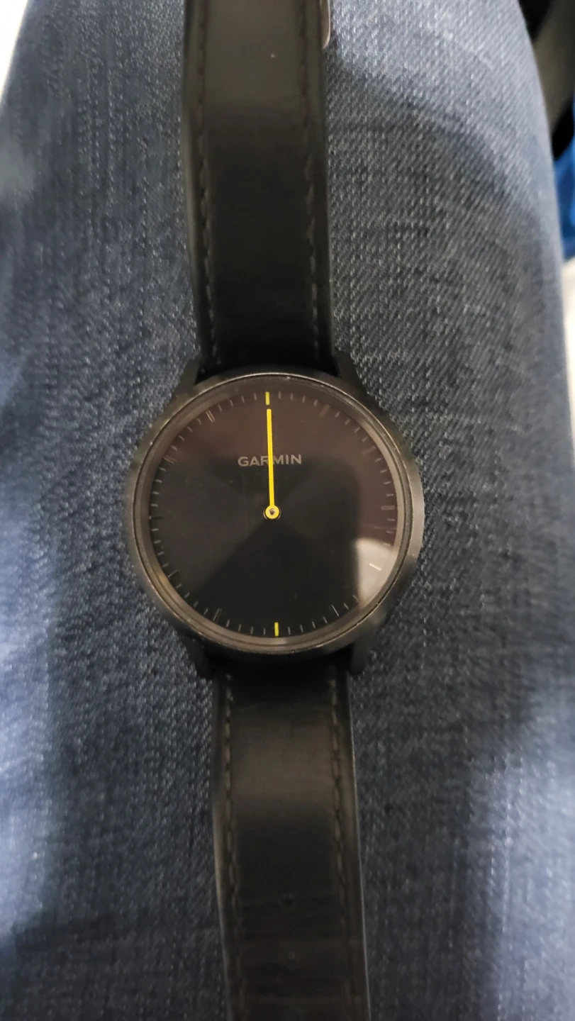 Garmin Vivomove smartwatch with a black leather band. This watch has an analog display with a discreet touchscreen. It tracks your steps and heart rate. It's great for everyday wear and light activity. No Charger.