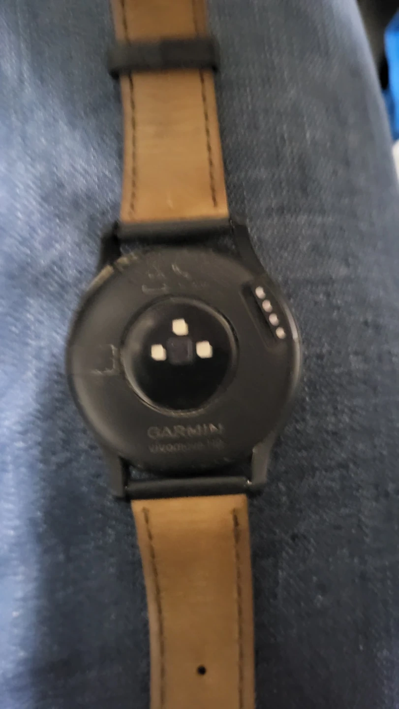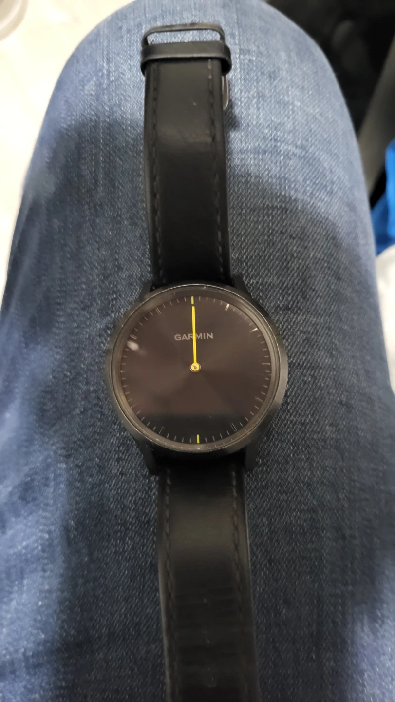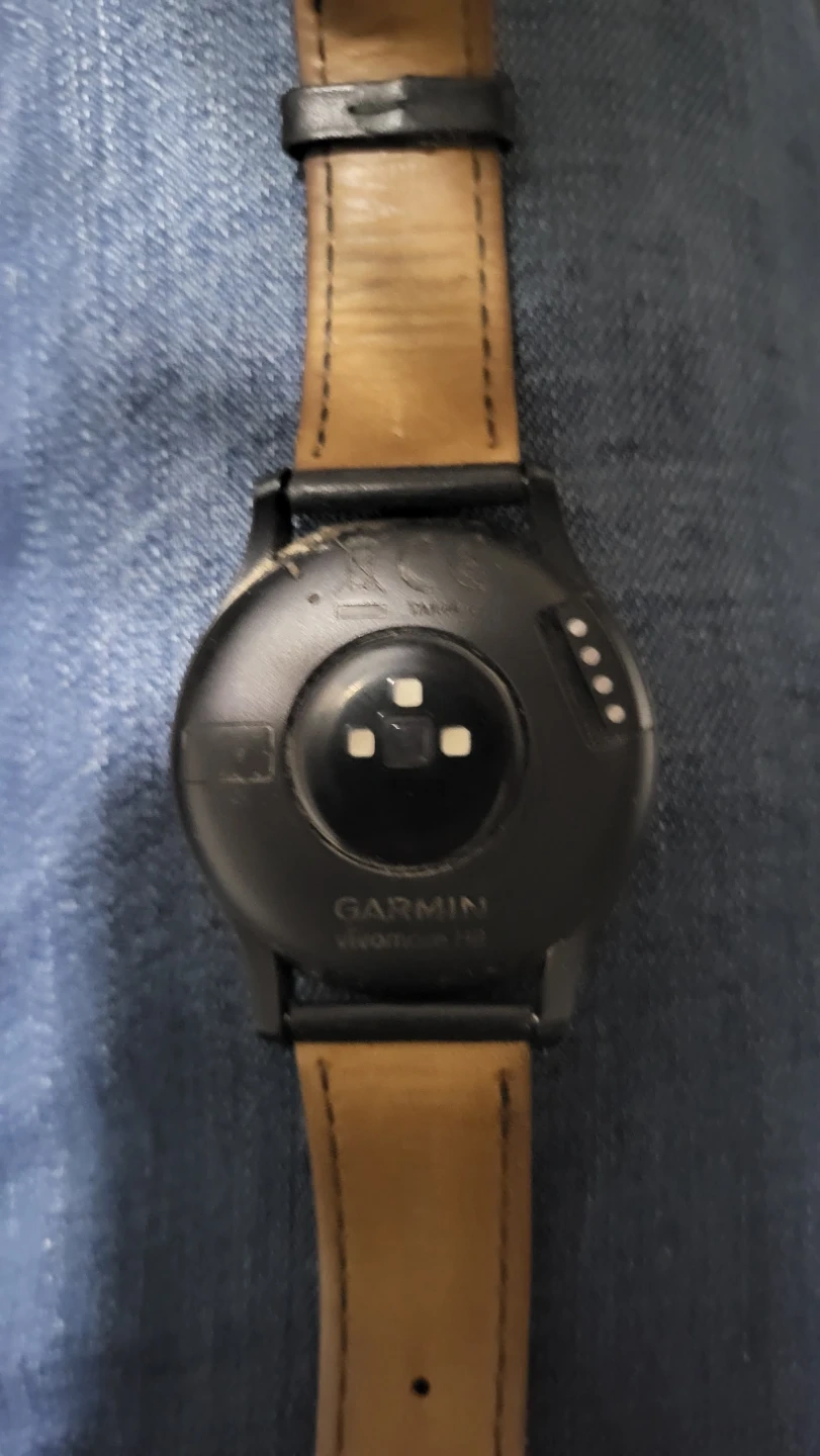 Garmin Vivomove smartwatch with a black leather band. This watch has an analog display with a discreet touchscreen. It tracks your steps and heart rate. It's great for everyday wear and light activity. No Charger.